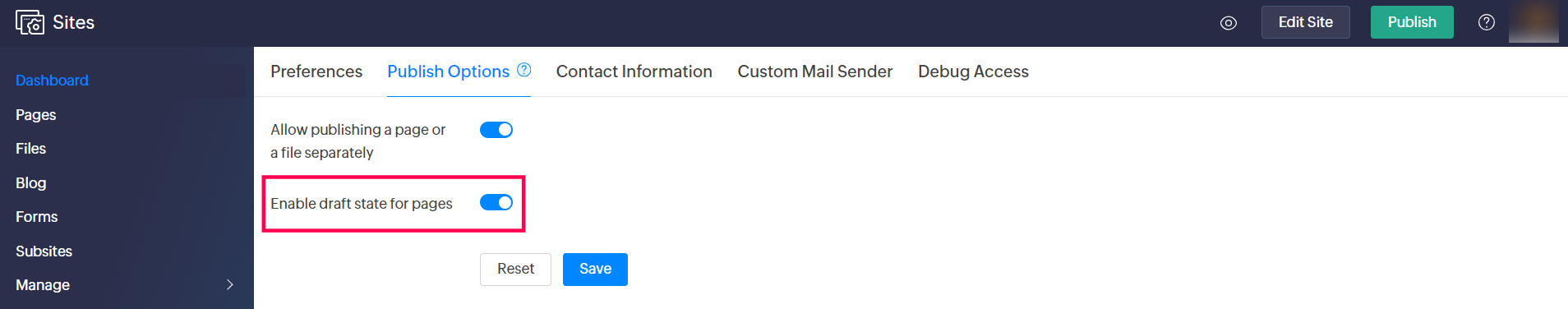 4. 有効にする 下書き 状態 for pagesトグルをクリックして、ページを下書きとして保存できます。下書きとして保存されたページは、サイト公開時に含まれません。保存をクリックします。