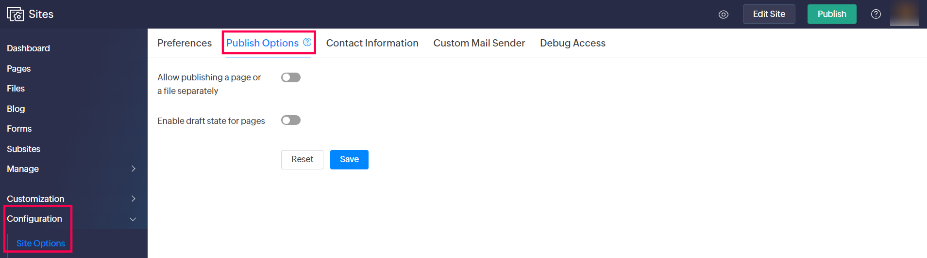 1. ナビゲート: Configuration -> Site 設定 -> 公開 設定へ移動します。
