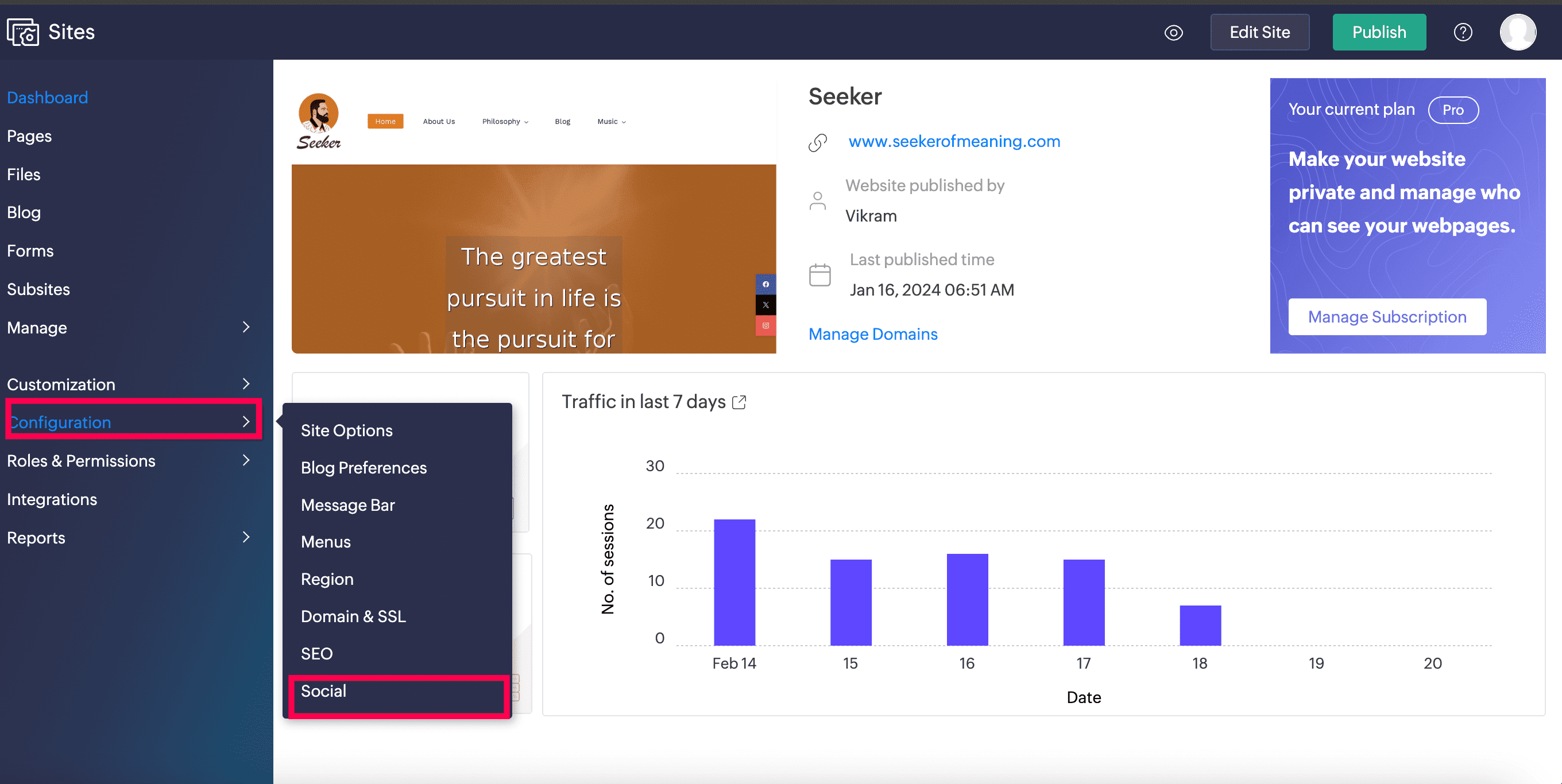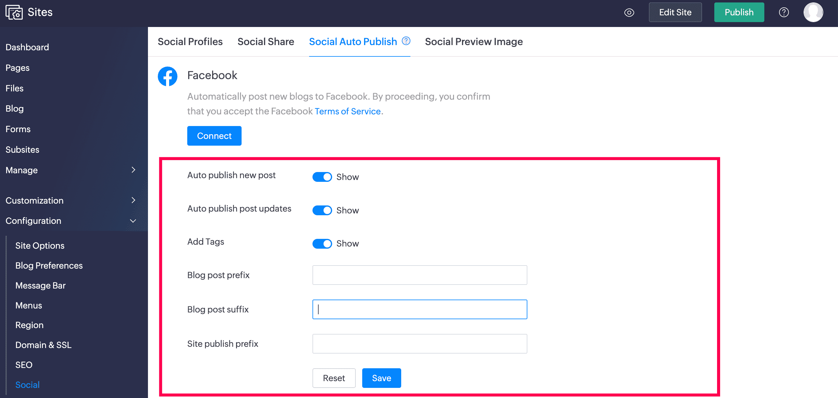 - Site 公開 接頭語: Webサイトを公開するたびにソーシャルメディア上でキャプションを表示したい場合は、ここに入力してください。