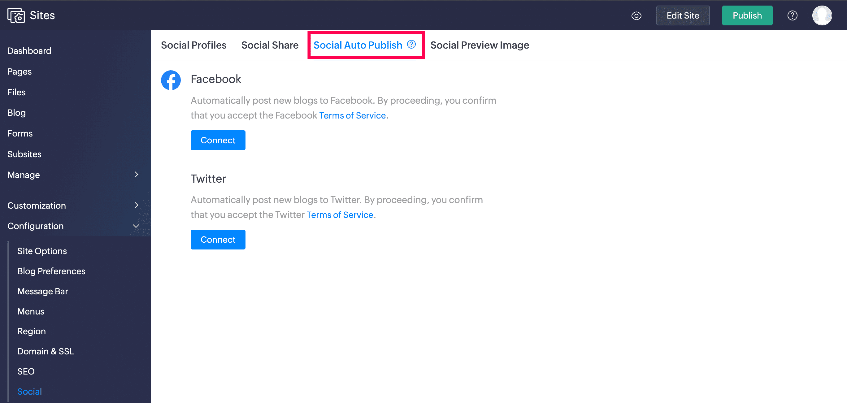 2. Social Auto 公開を選択します。設定画面が表示され、FacebookまたはTwitter取引先に接続できます。