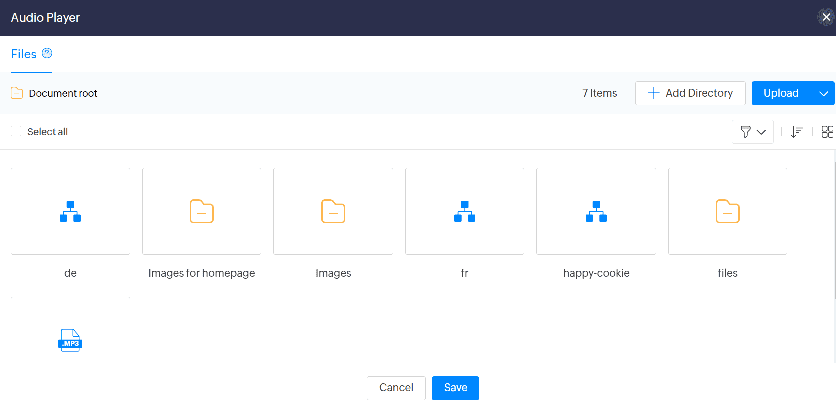 3. 次の画面でアップロードするをクリックし、パソコンからaudioファイルを選択します。