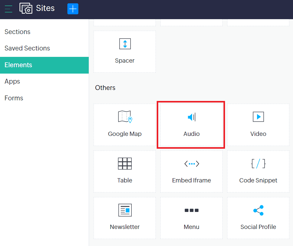 2. スクロールダウンしてaudioエレメントをクリックし、ページ上の任意のセクションにドロップします。