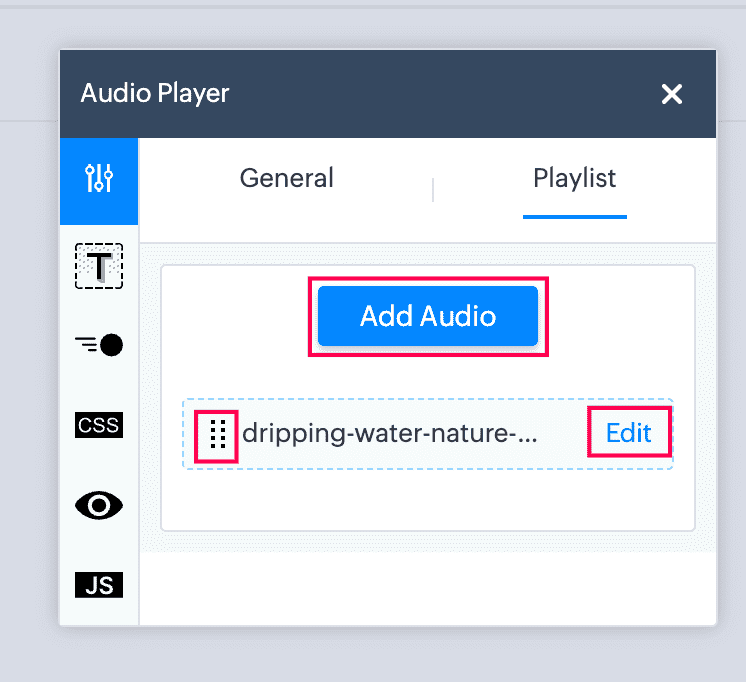 1. Audioエレメントにアクセスし、設定アイコンをクリックします。