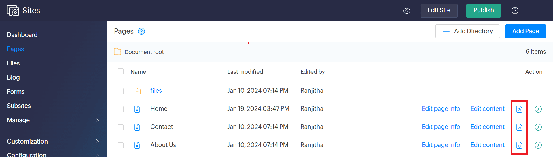 2. 各Webページの右側(編集コンテンツボタンの横)にあるアクセス アイコンを探します。アクセスコントロールを有効にしたいページのアイコンをクリックします。