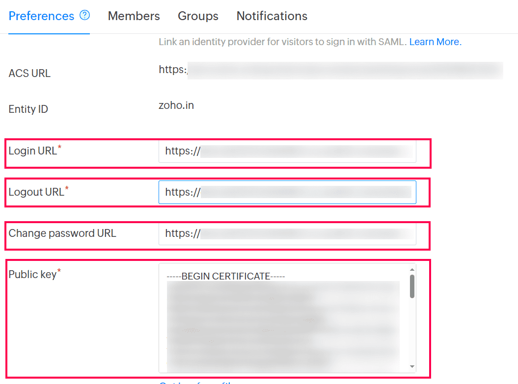 2. Identity Provider ログインするURLをAuth0アプリケーションからコピーし、Zoho Sites の両方ログインするURLとパスワードを変更URLとして貼り付けます。