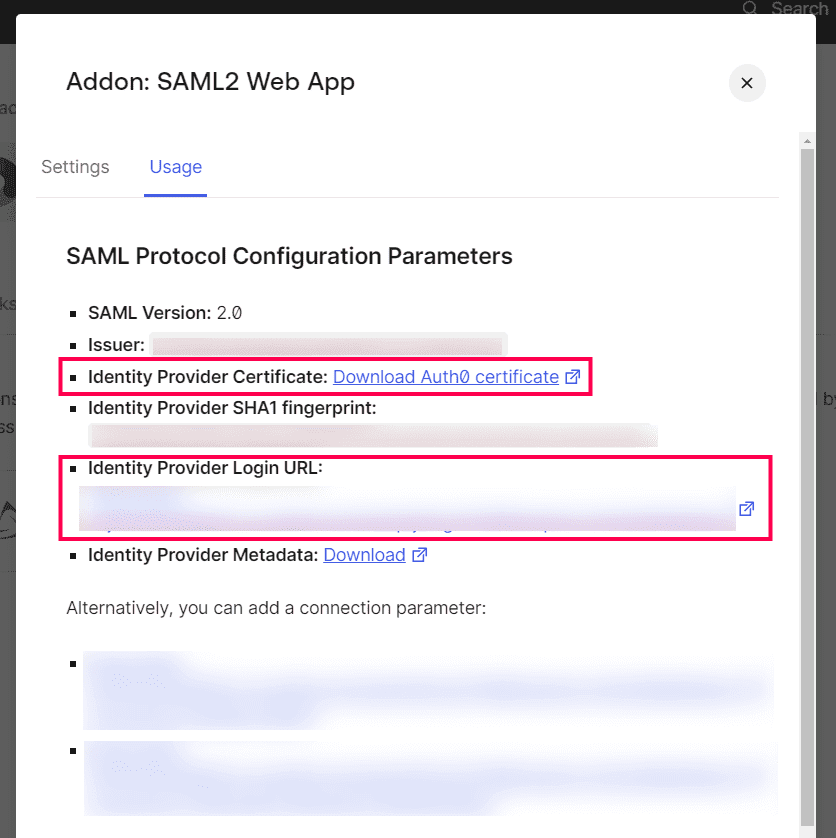 1. Usageタブで、Auth0証明書をダウンロードします。ダウンロードした証明書は .pem ファイルです。
