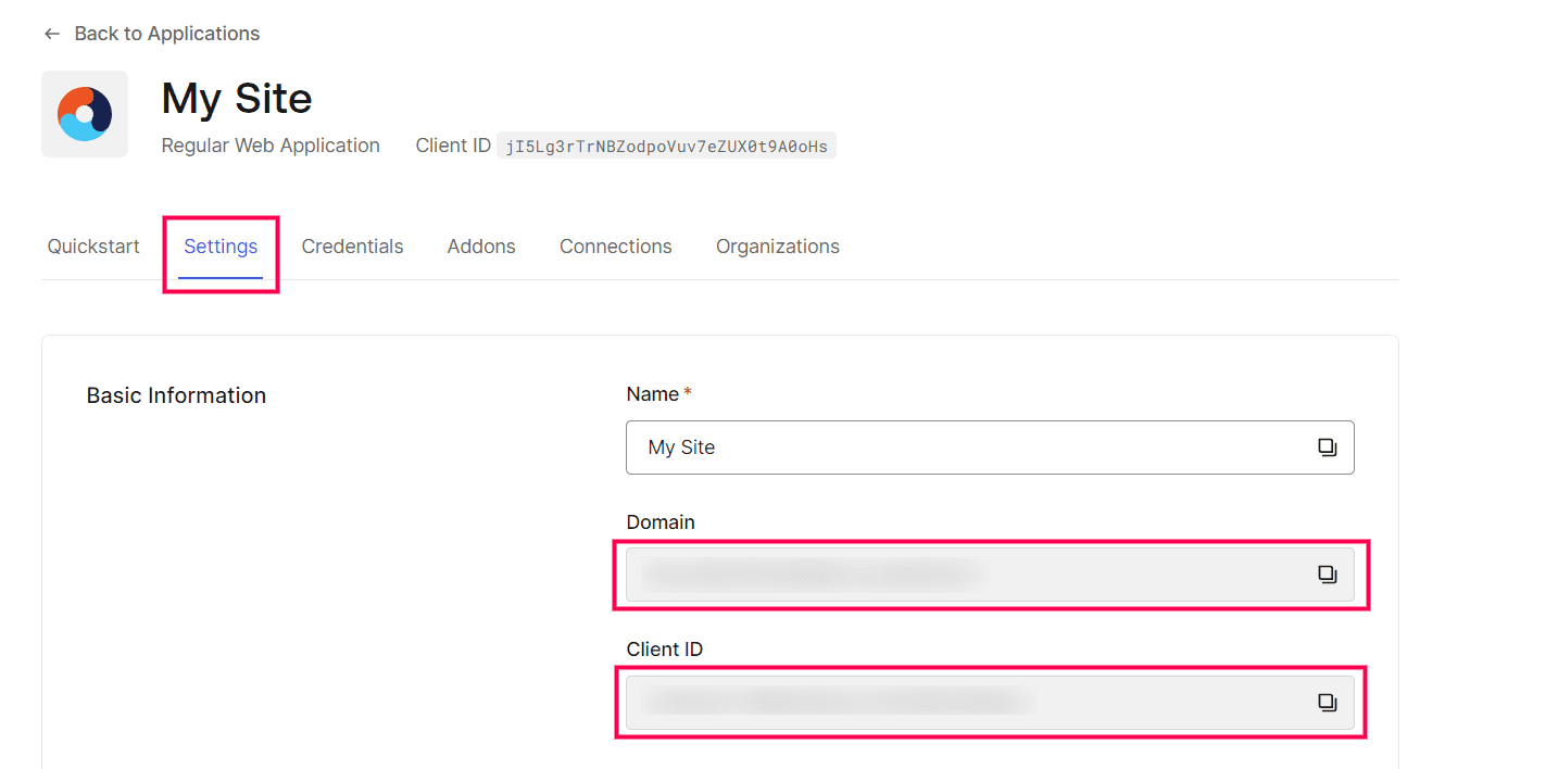 7. 作成したアプリが表示されます。上部メニューの設定を選択します。ここでドメインクライアントIDを取得できます。