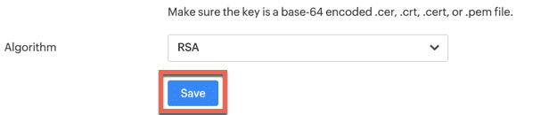 7. 必要なURLをすべて入力した後、アルゴリズムとしてRSAをドロップダウンから選択し、Zoho Sitesで保存をクリックします。