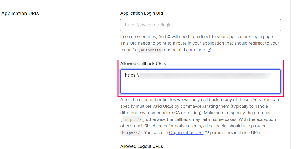 8. Application URIs までスクロールし、Zoho Sites画面から取得したACS URLをAllowed Callback URLsに貼り付けます。