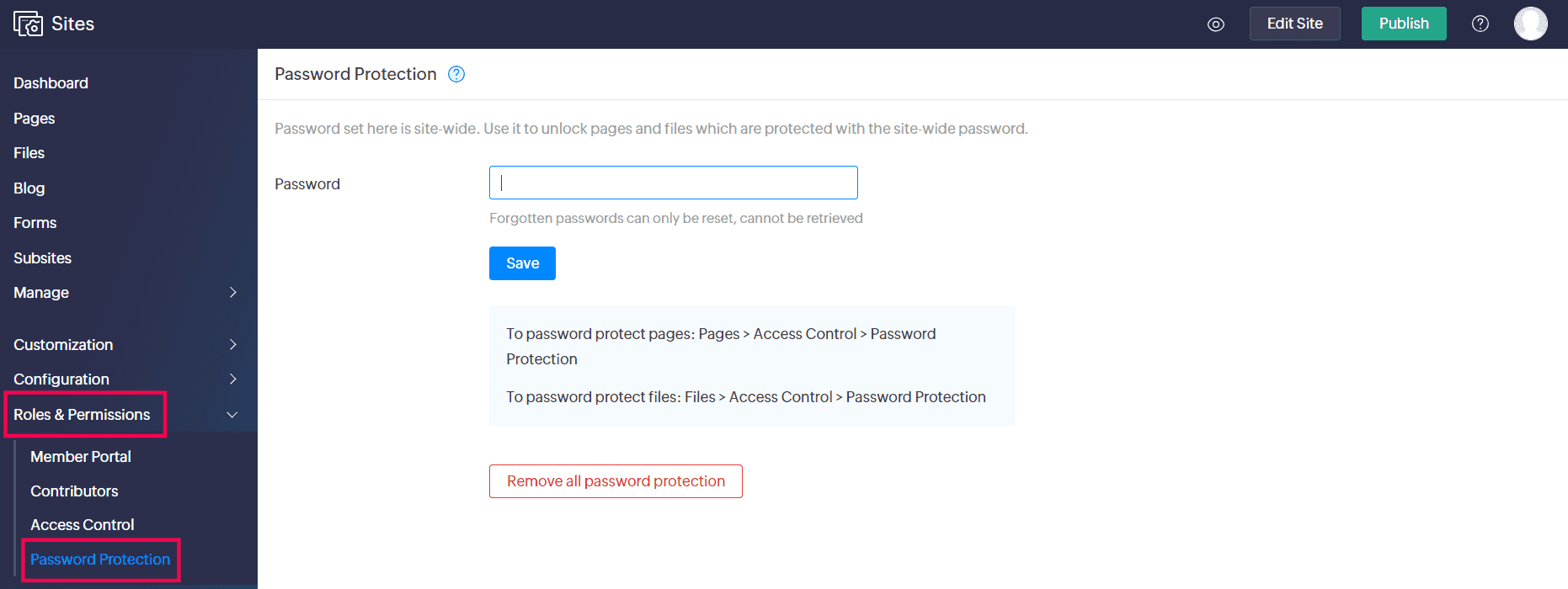 ページをパスワード保護する場合は、Pages > Access Control > パスワード保護に移動します。