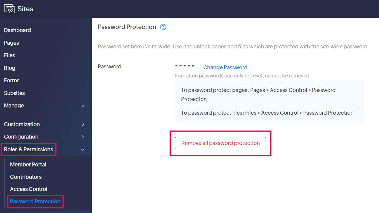 2. すべてのパスワード保護を削除をクリックします。これにより、すべてのページおよびファイルに設定されているパスワード保護が解除されます。