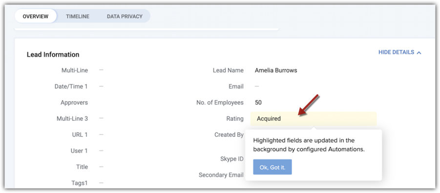For example, if a function is configured to update lead rating value via the Data Enrichment tool, then after saving a record the field will be updated automatically. It will be highlighted for easy identification. (Note that, the popup will be displayed only once).
