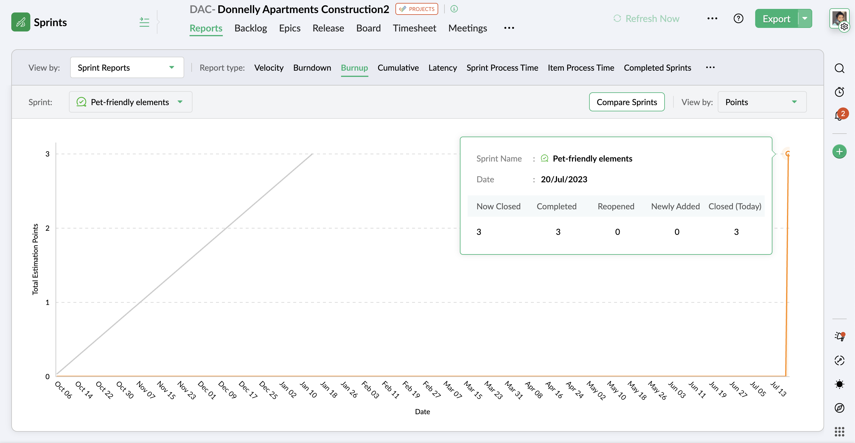 Using Burnup chart, you can track the total completed, reopened, or newly added points on a daily basis. Scroll down the chart and view the table below that lists the sprint details.