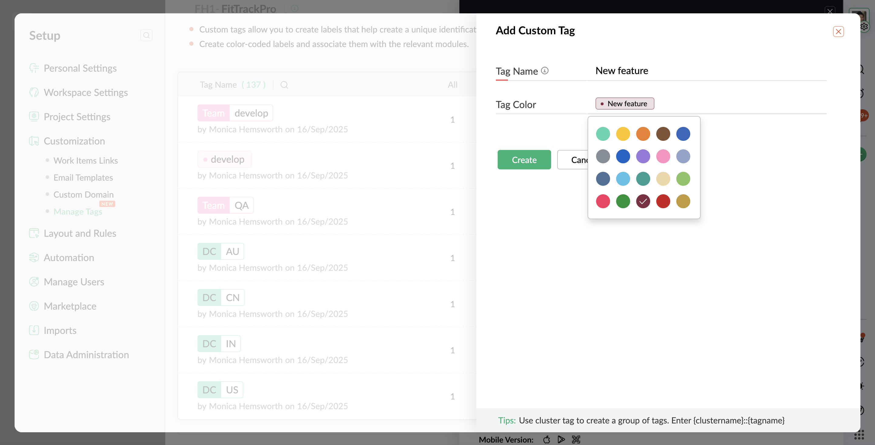 - Admins and workspace owners can add, edit, delete, associate, and dissociate tags for all the modules across projects.