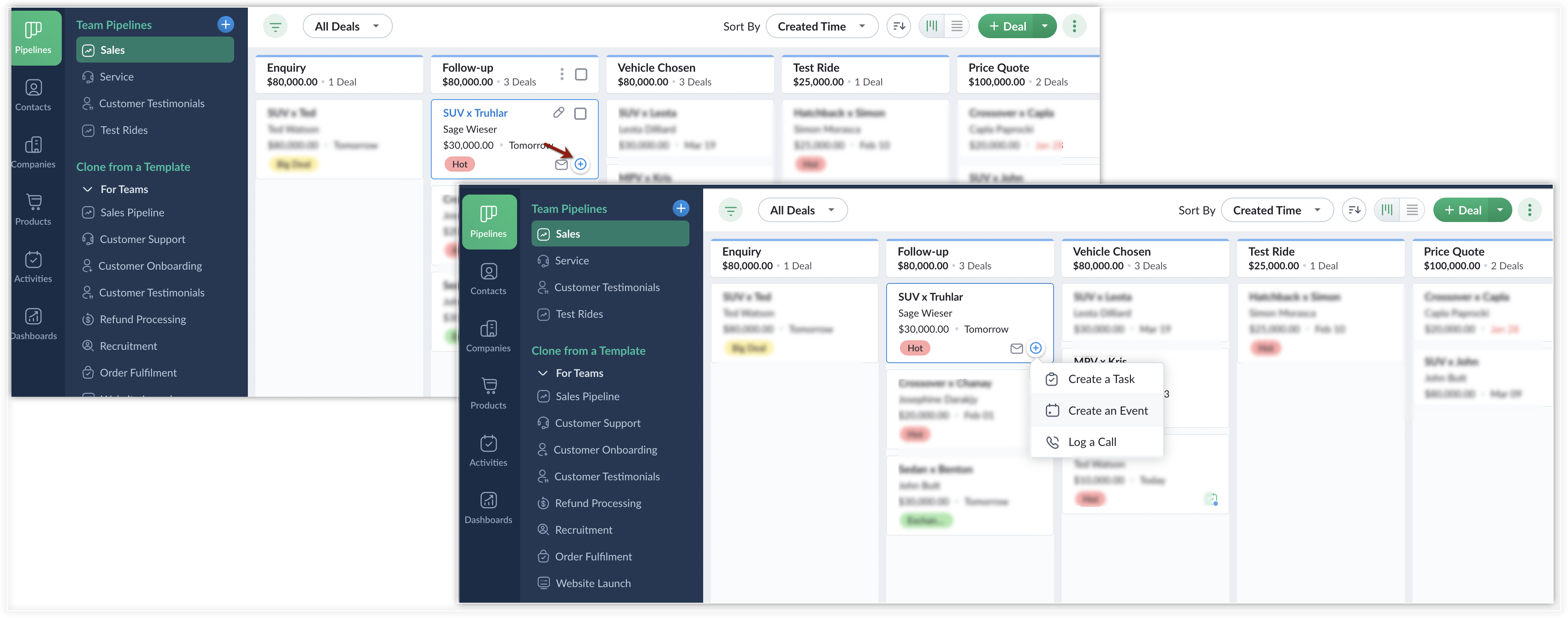 These Team Pipelines and Sub-Pipelines are present in the Pipelines module. And, depending on your Team Pipeline, you can have different kinds of pipeline record. For example, Zylker Cars has Team Pipelines like Sales, Service, Testimonials, Refunds, Test Rides, and more, all in a single Bigin account. Each Team Pipeline will store pipeline-specific records like Deals, Job cards, Testimonials, Refund, and Test Rides.