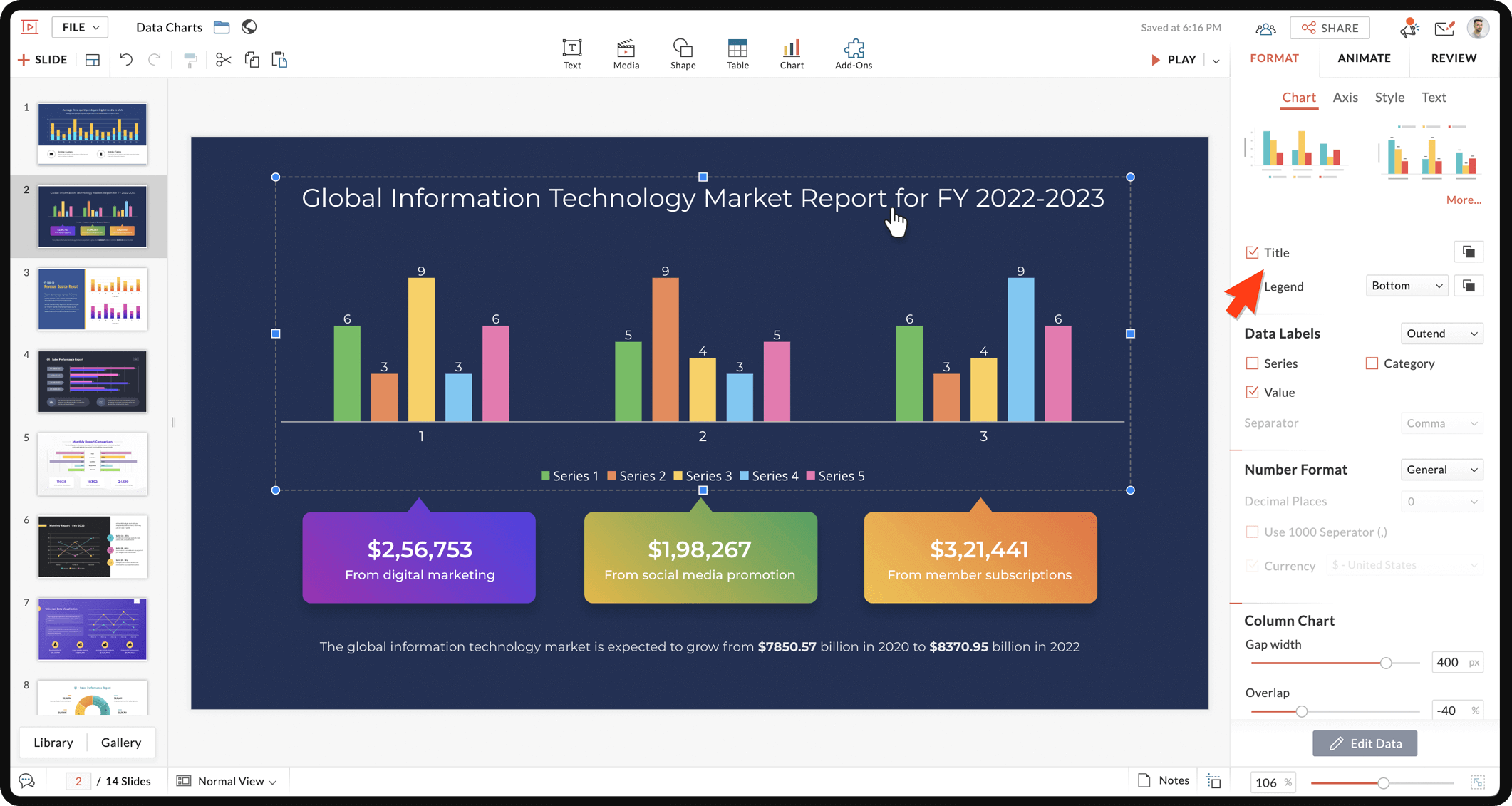 Each chart you add to your slides is unique and presents data in a different way. You can choose to customize your charts using a variety of chart formatting options (styles, designs, and layouts, or change color, borders, axis ticks, labels) to make them more visually attractive and to highlight impressive data.
