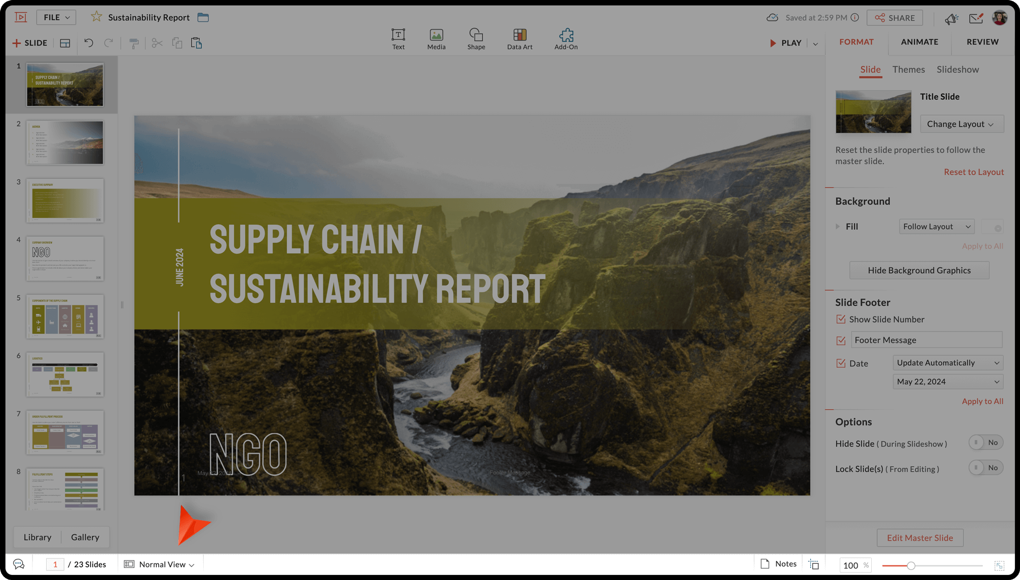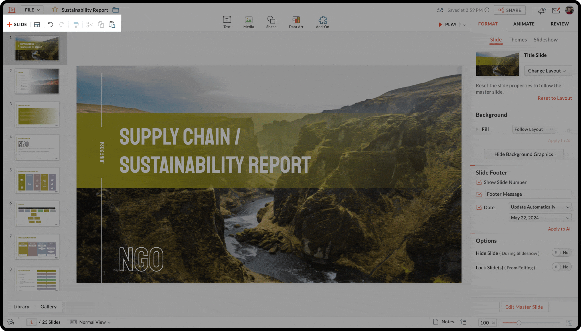 FORMAT: Slide formatting options like Slides, Themes, and Slideshow and design element options can be viewed within FORMAT in the right pane.