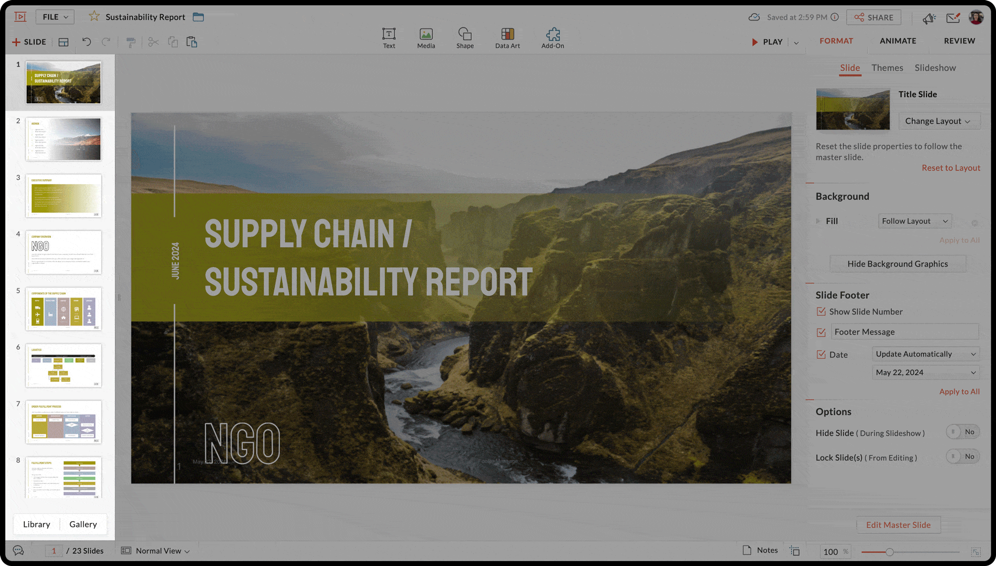Library section: Lets you store and organize items under Templates, Slides, and Fonts. The pre-defined layouts and styles help your team quickly get started with the presentation.