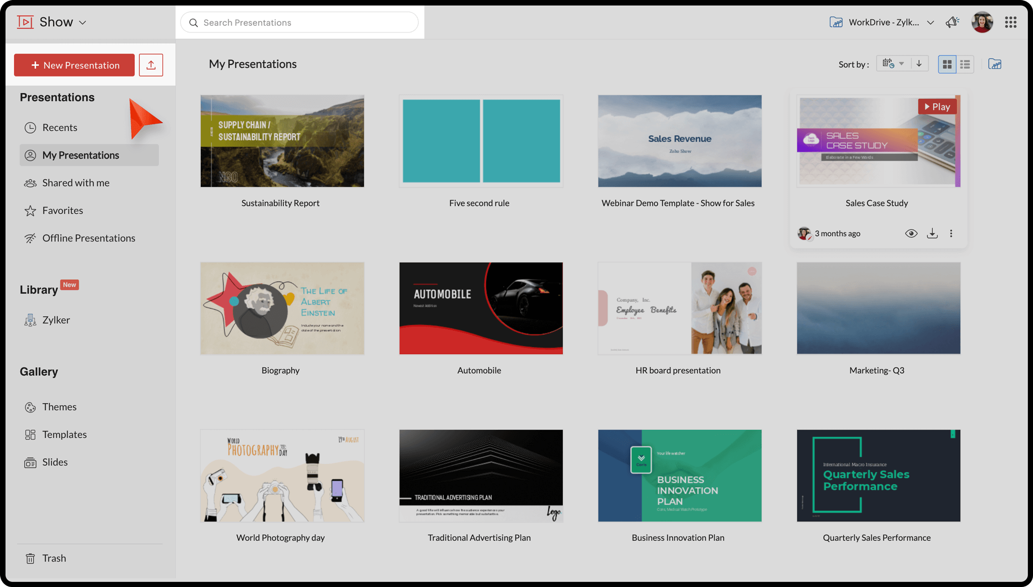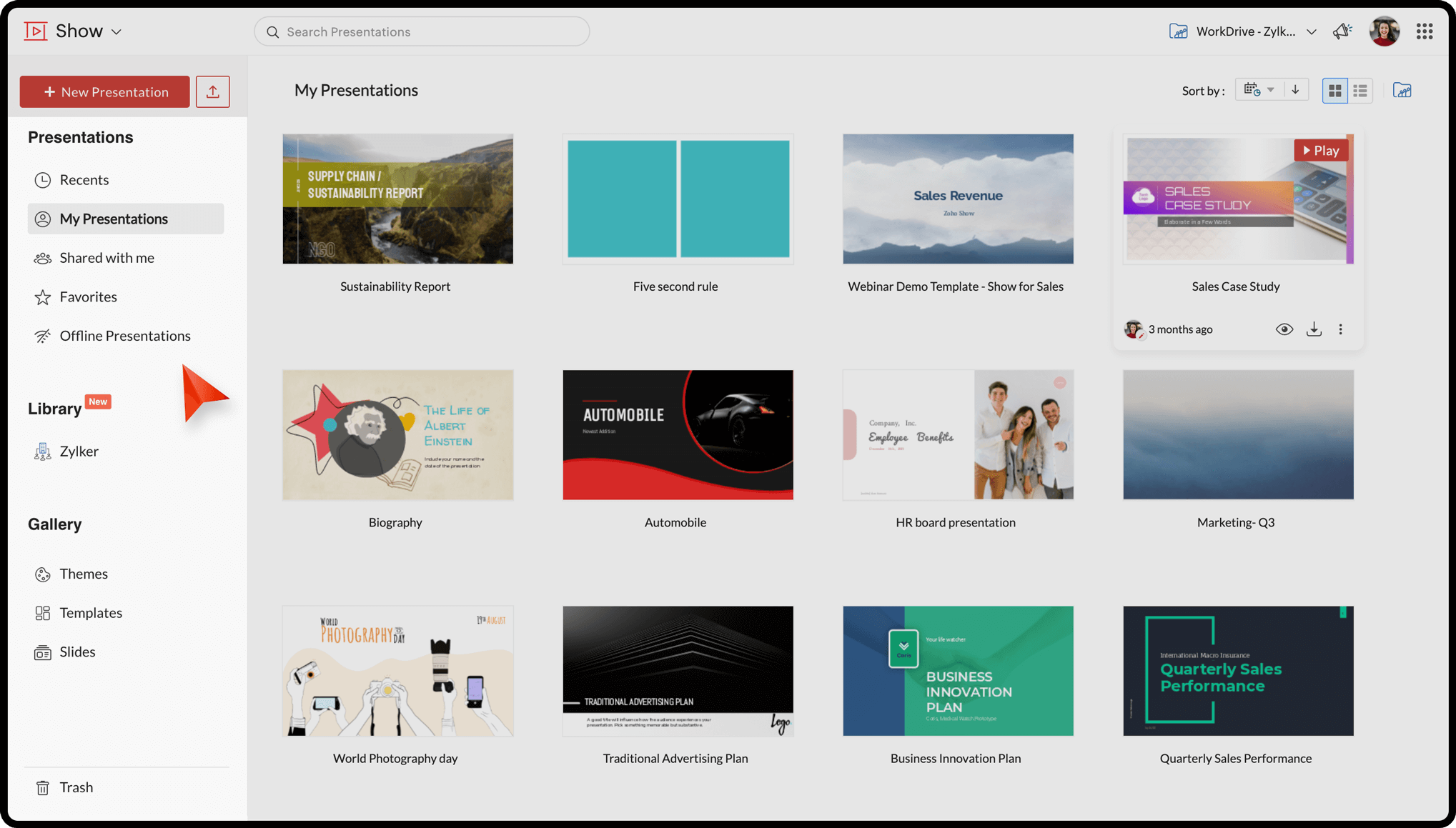 In each of these below sections, you can search for a presentation; arrange them in Grid View or List View; sort them based on Date created, Date Opened, Date Modified or Name; and order them by the date the presentations are created. You can also access presentations stored in your WorkDrive account.