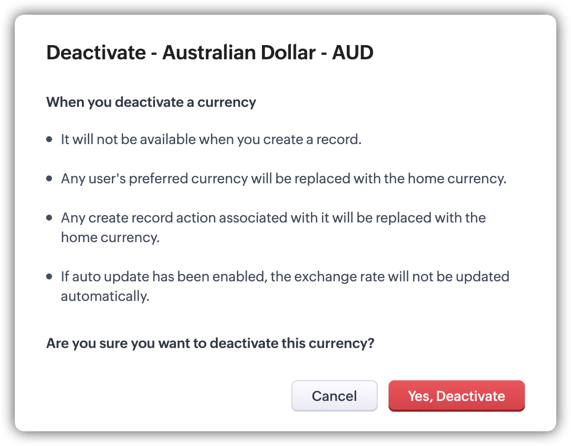 Records that are converted with inactive currencies will be replaced with the home currency and the currency field values will also be converted based on the exchange rate. During deal creation, a validation error will be shown requesting the user to choose an active currency if the currency field is present in the form; otherwise, the deal will be created with the home currency. |