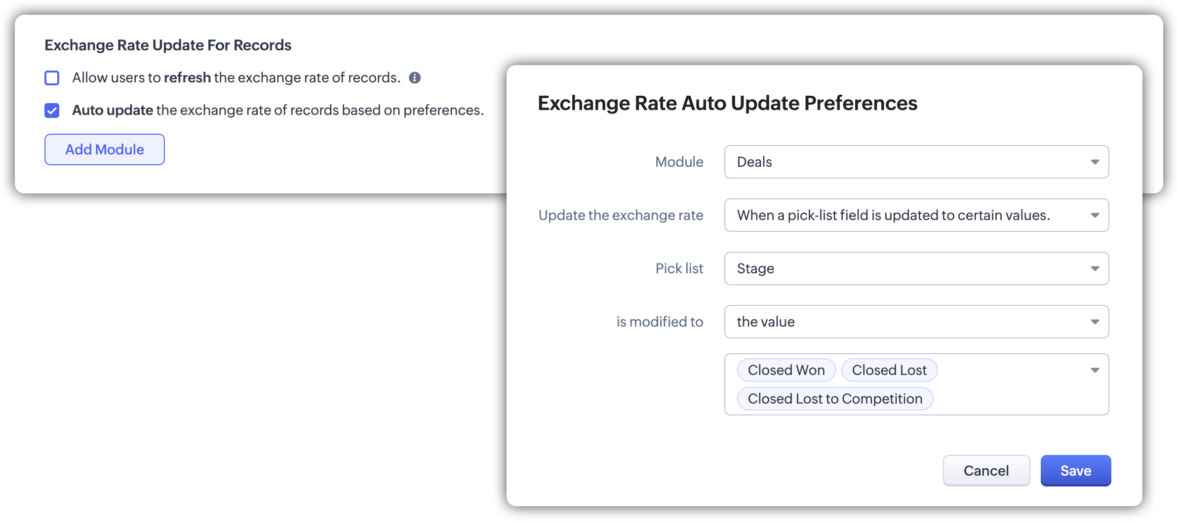 Automatic updates are configured at the module level. You can choose the modules for which exchange rates should be updated automatically and define the conditions that determine when the update should occur. Only modules that contain at least one currency field are available for selection.