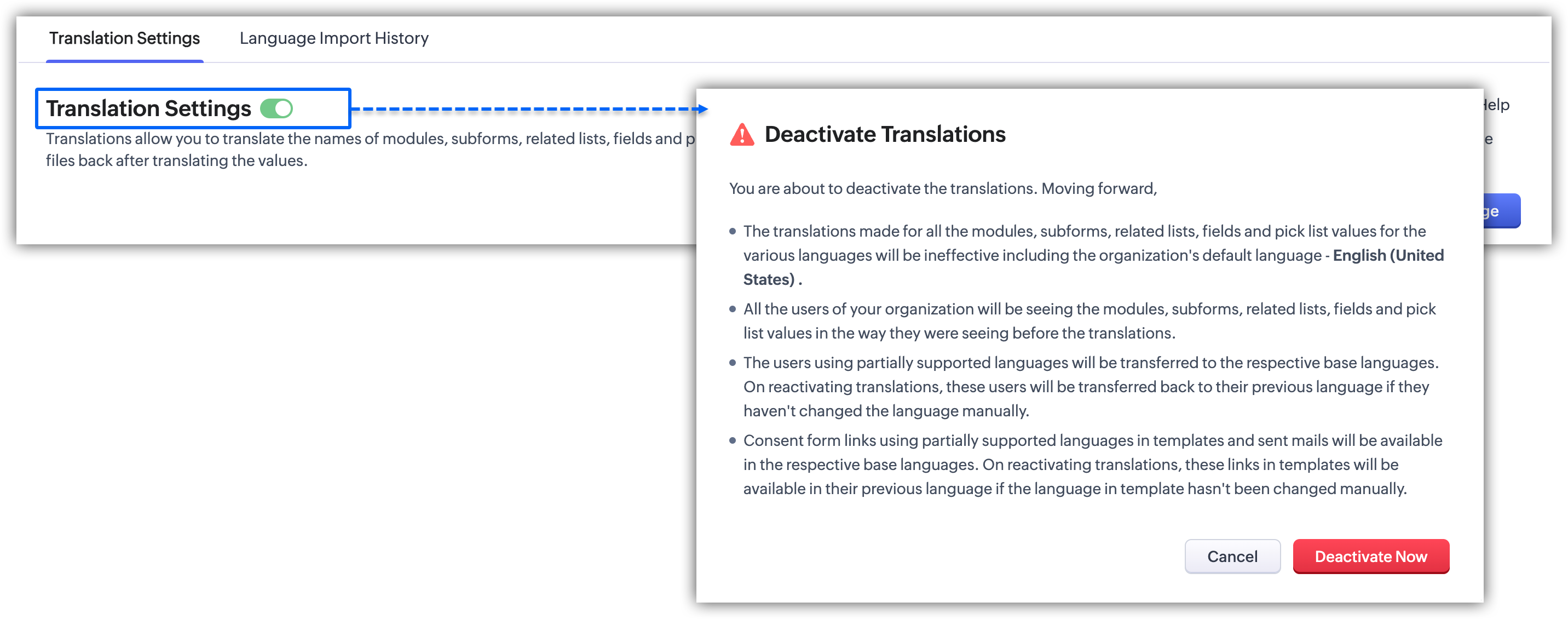 - If you no longer want to use translations in your CRM account, you can deactivate the entire translation setting.