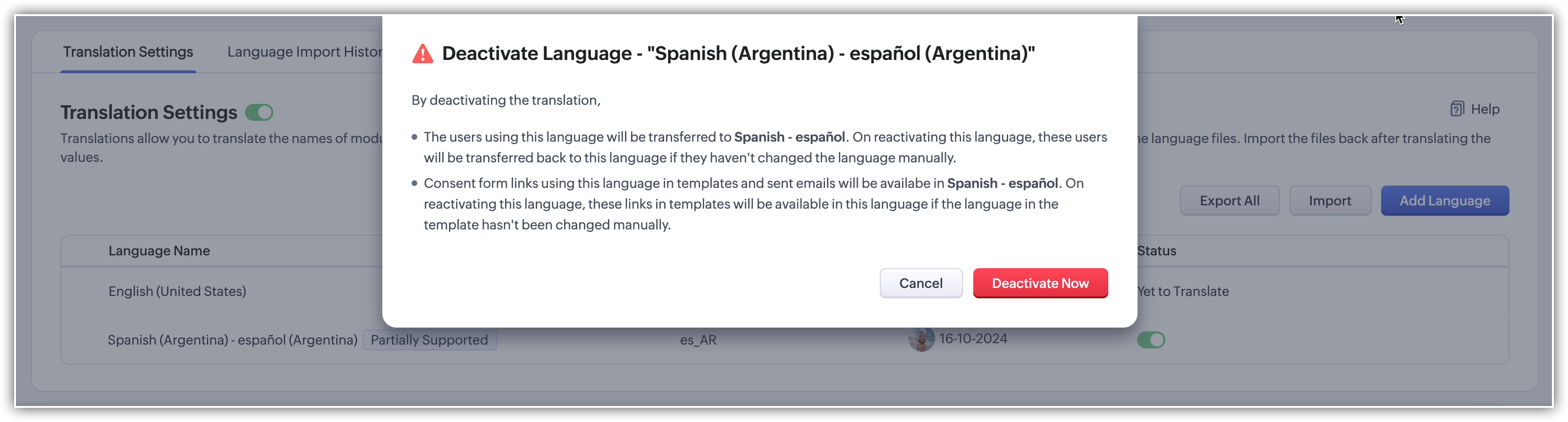 - When you deactivate a partially supported language, users who are using that language will be transferred to its default language.