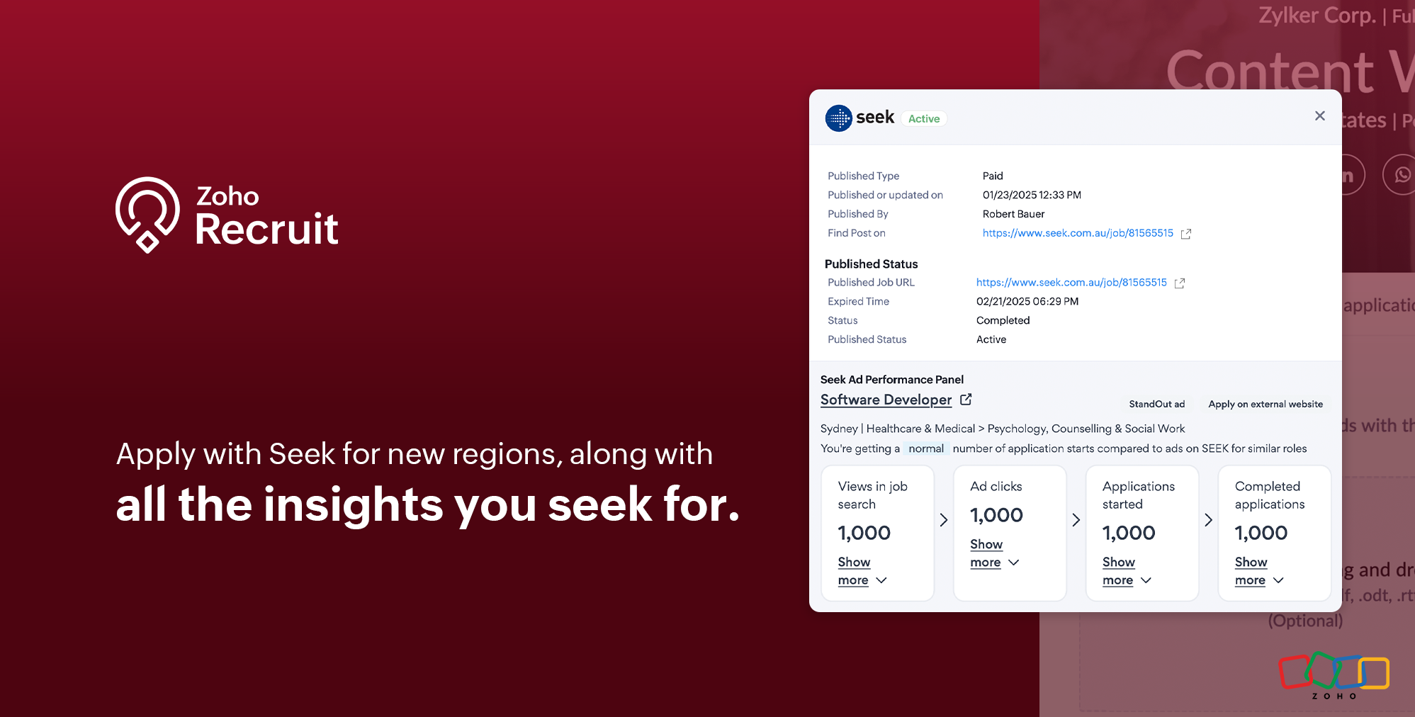 SEEK’s ad-application panel provides recruiters with valuable metrics, like clicks, searches, and applications. All this data is available directly within Zoho Recruit, offering actionable insights without needing to switch platforms.