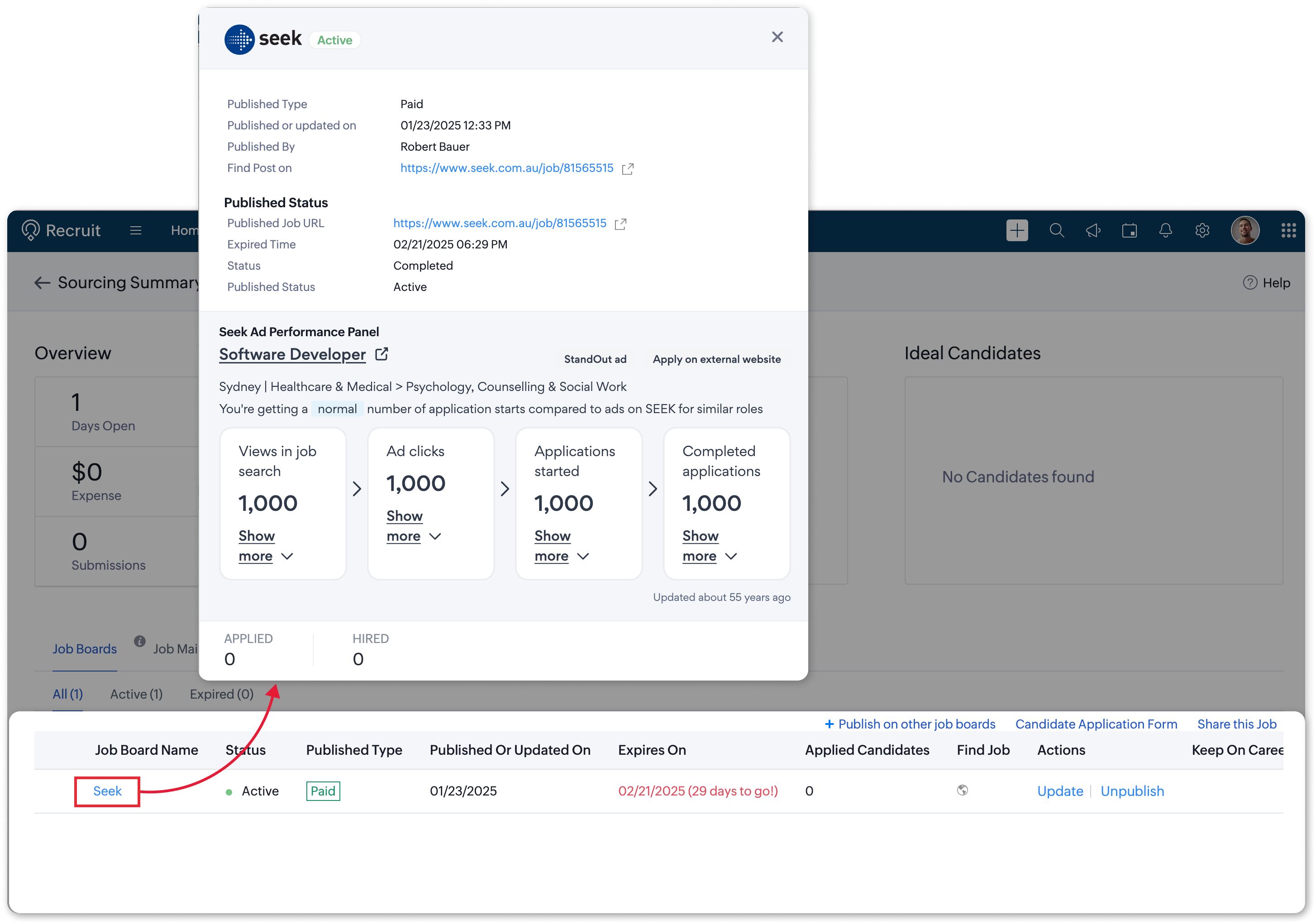 - Click on the respective job opening published using SEEK, select Sourcing Summary.