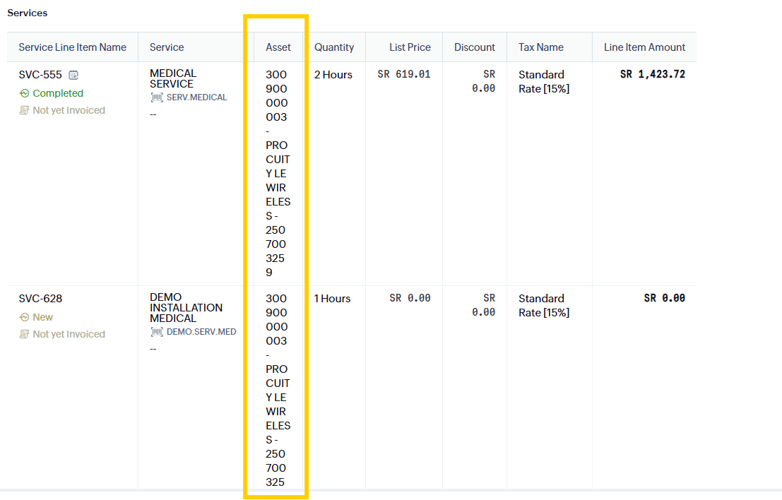In the Work Order, once we add the Service Line Item assets and save the record, the output table looks like this (refer to the screenshot below).