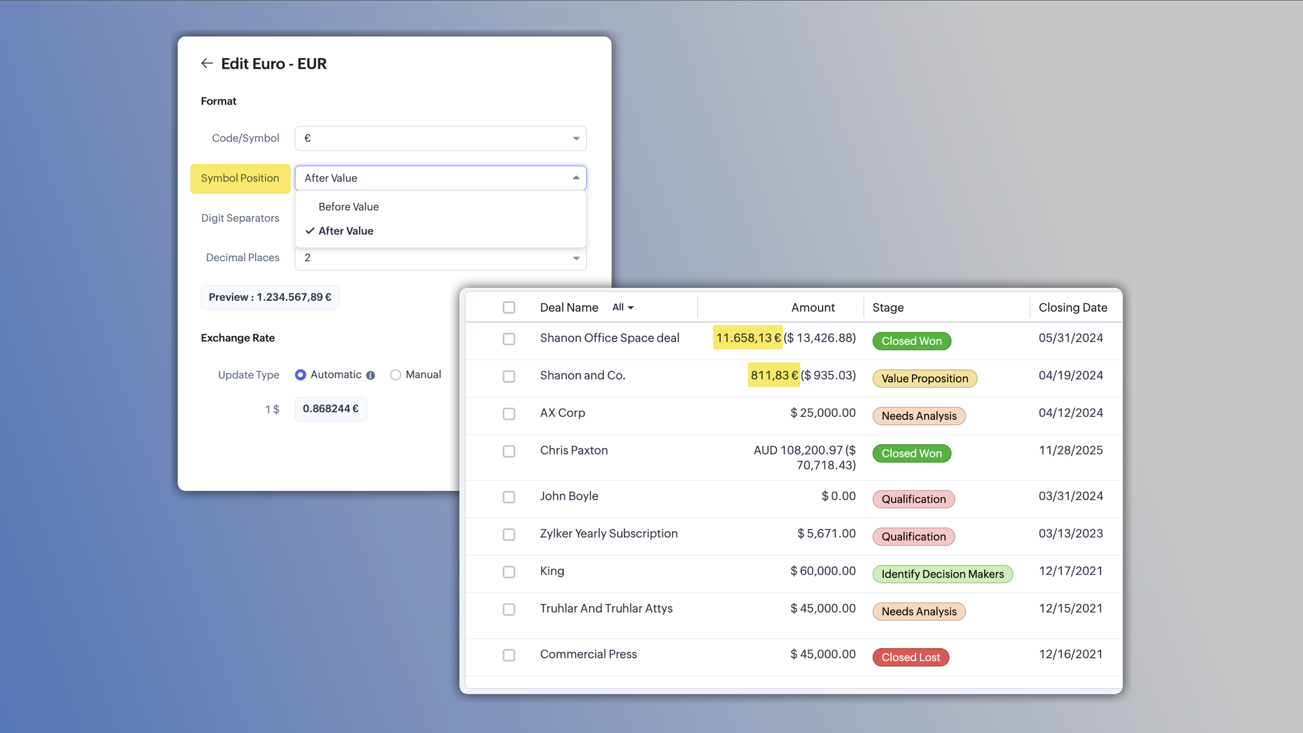 Set the symbol before or after the value per currency. Your choice appears consistently across your CRM.
