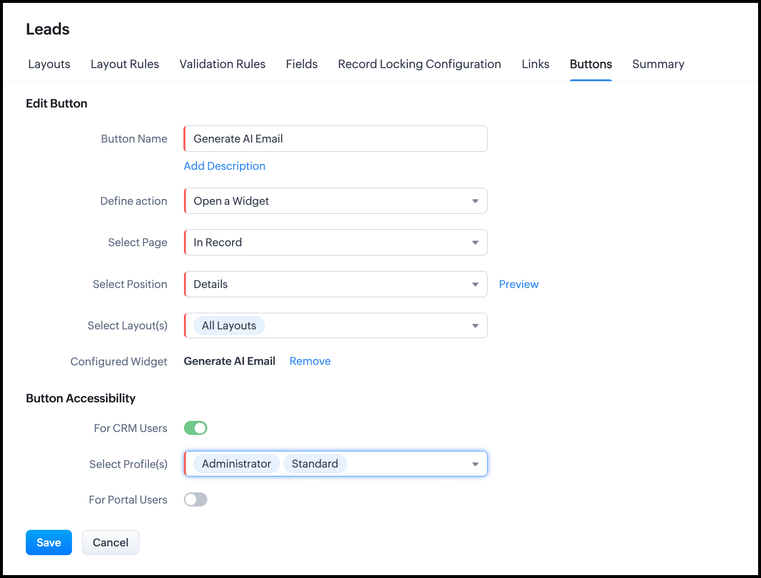 4. Test: Button appears on Leads; clicking loads widget in context.