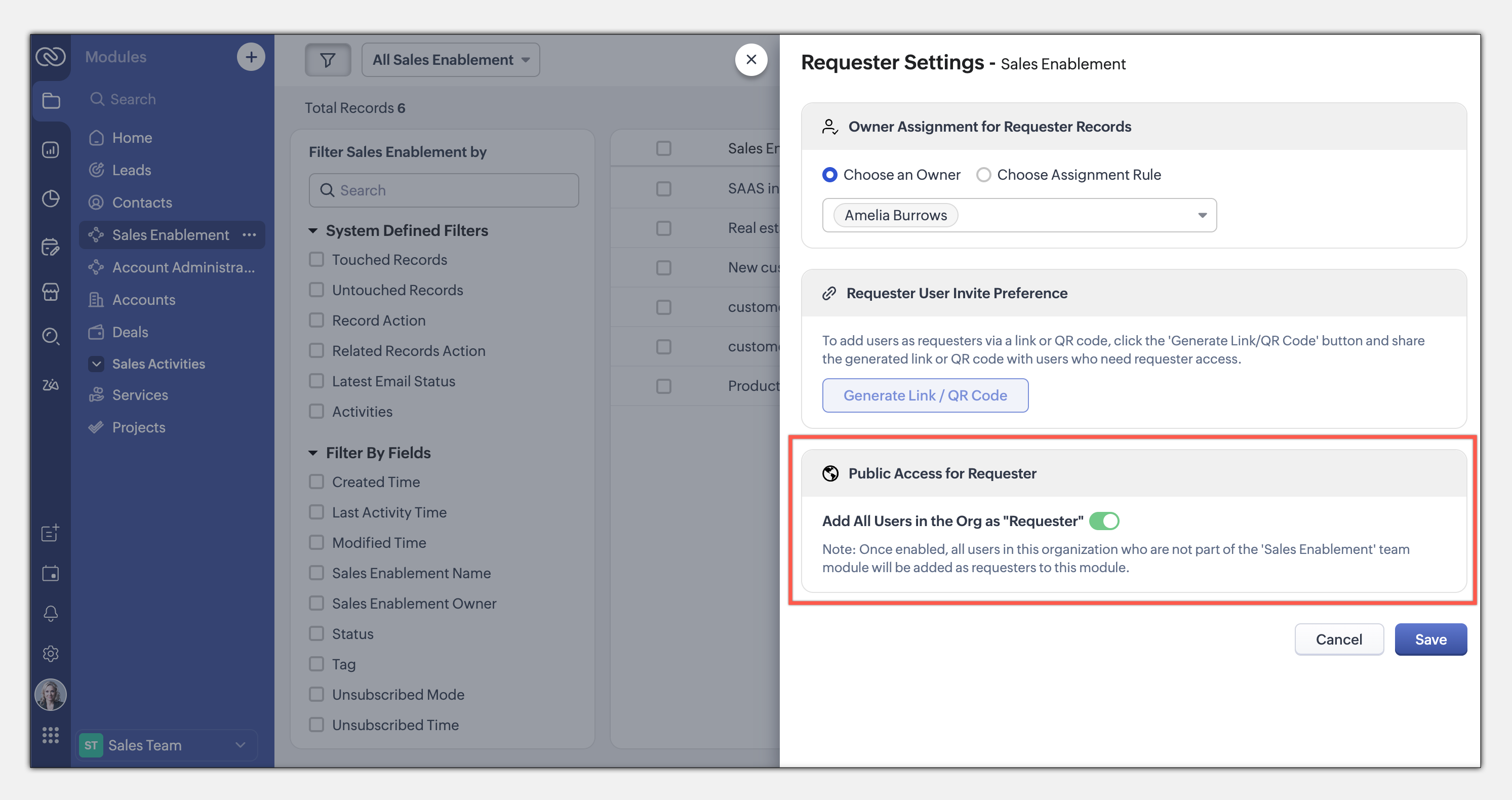 Example: A Sales Enablement module can be accessed by Product, Marketing, or Training teams to submit requests for sales insights.