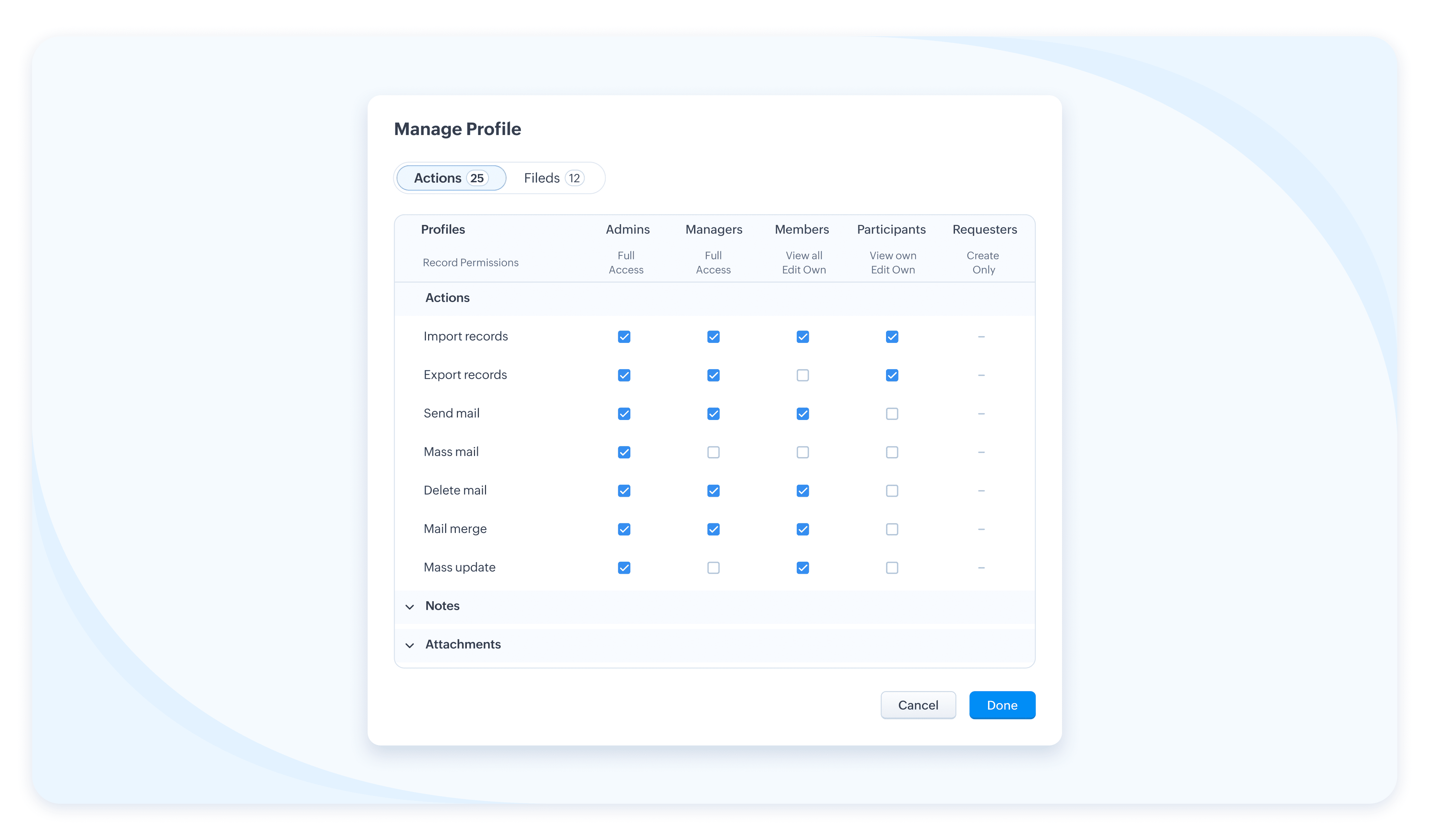 To ensure data security and integrity, Team Modules come with module-level access controls that let you manage permissions with precision. Team Modules include different types of users or roles: