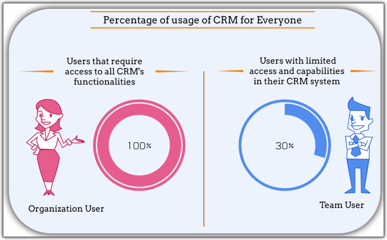 • A Team User is typically a non-sales team member, whose work could be managed in CRM alongside sales, as they have a part to play in the entire customer-oriented process. For example: A presales executive who needs to step in to give a product demo to a customer right after a salesperson's pitch. Alternatively, a Legal team member might have to process contract signatures while closing a deal. Additionally, a Training team member who will take up a training request for a customer on-demand.