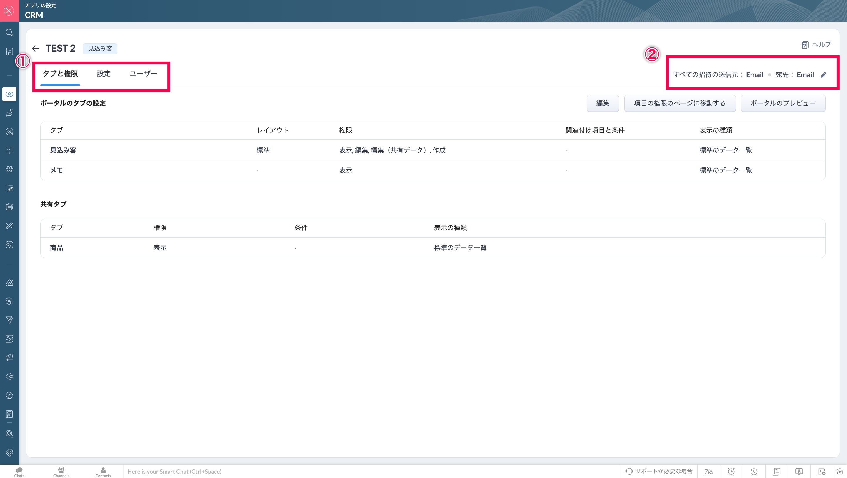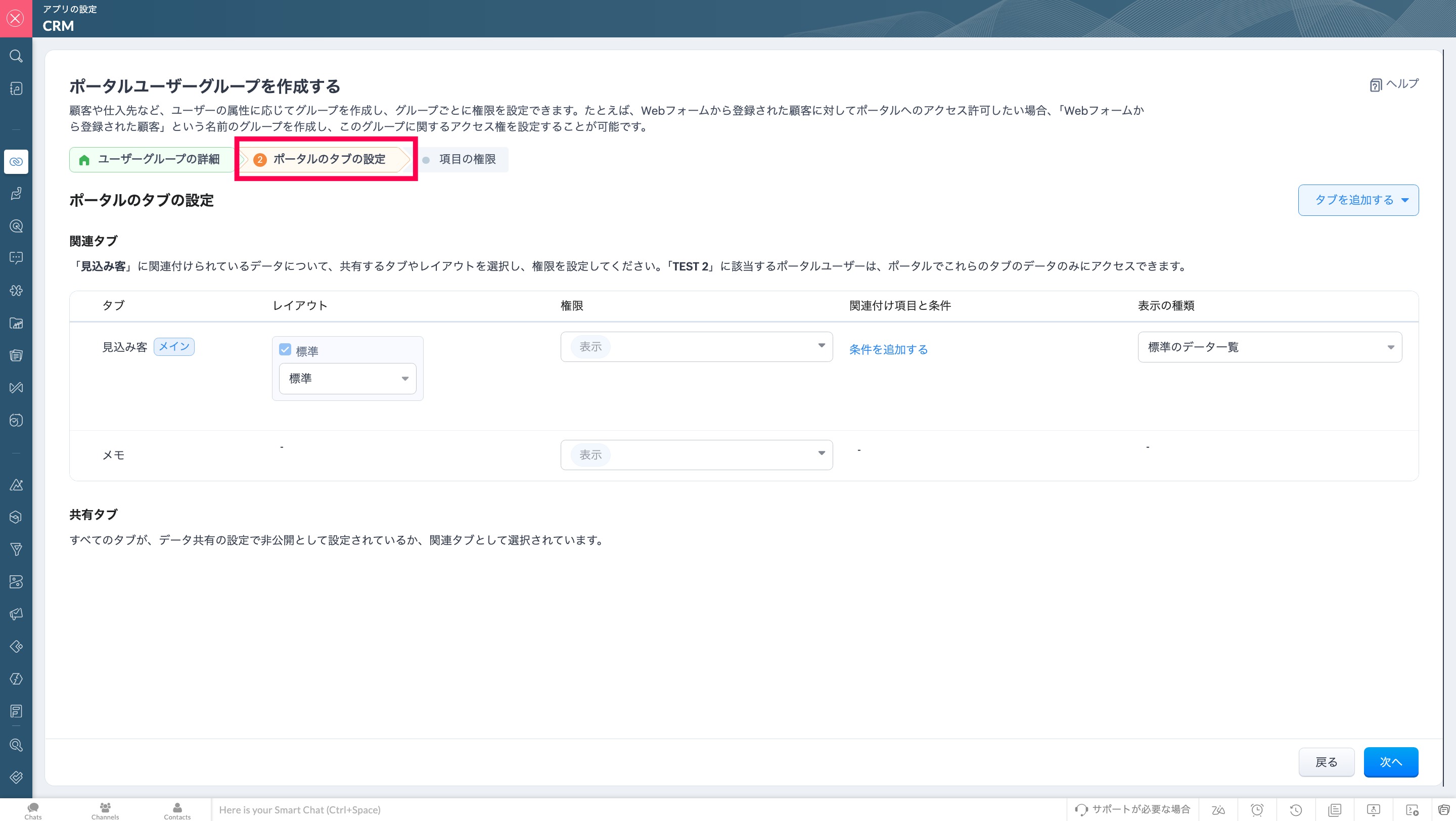 「タブと権限」タブでは、必要なタブの設定と権限を行うことができます。