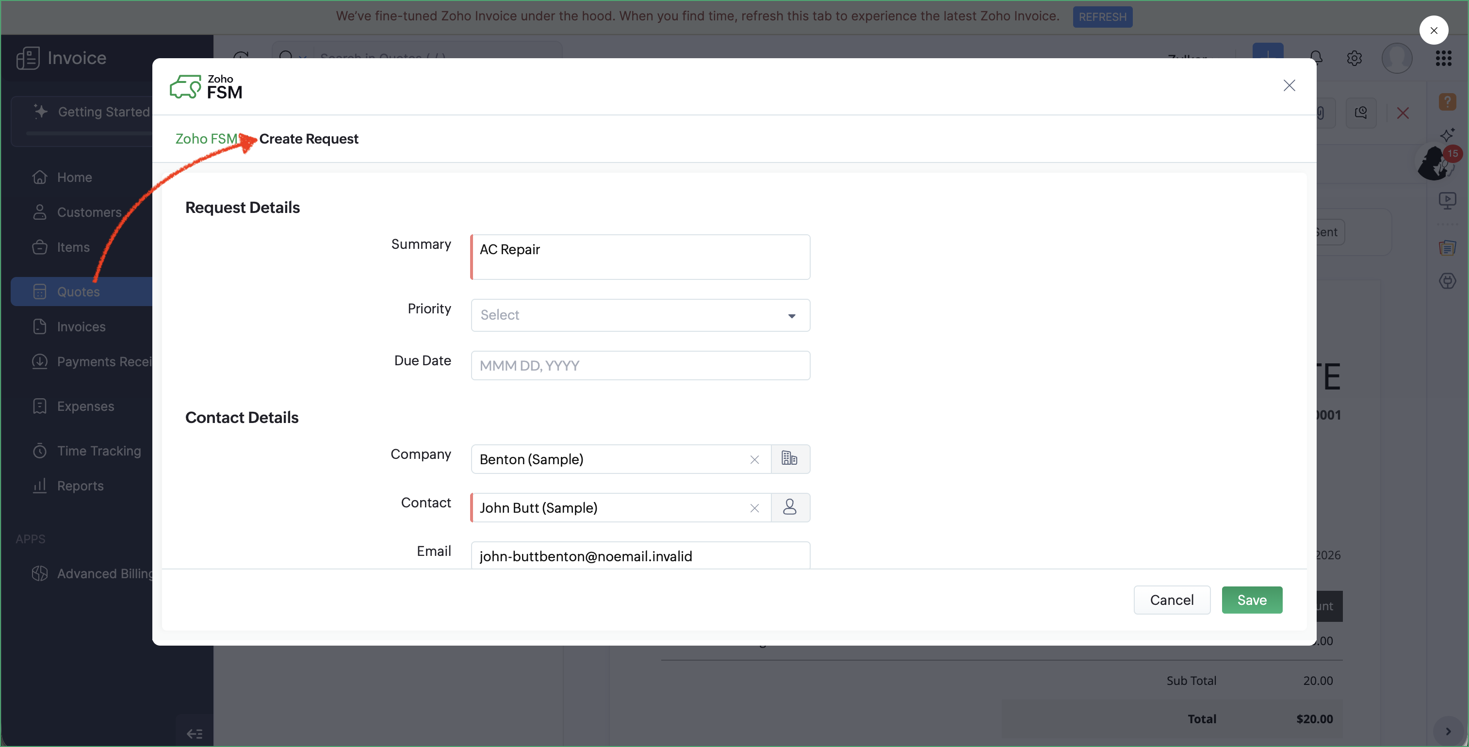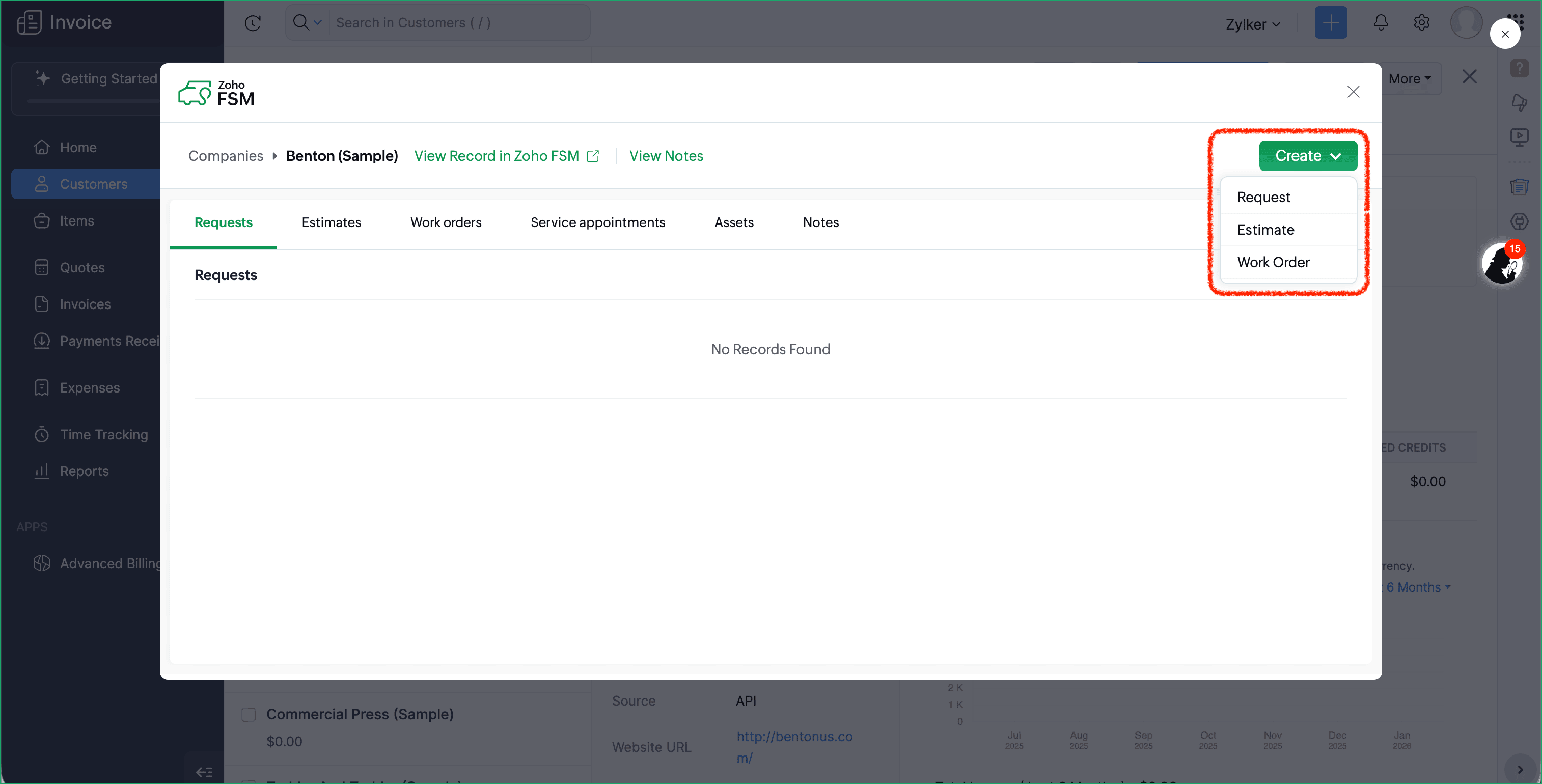 - From Customer to Call Center Agent: Standing on a Customer record in Zoho Invoice? You can instantly spin up a Zoho FSM Request, Estimate, or Work Order.