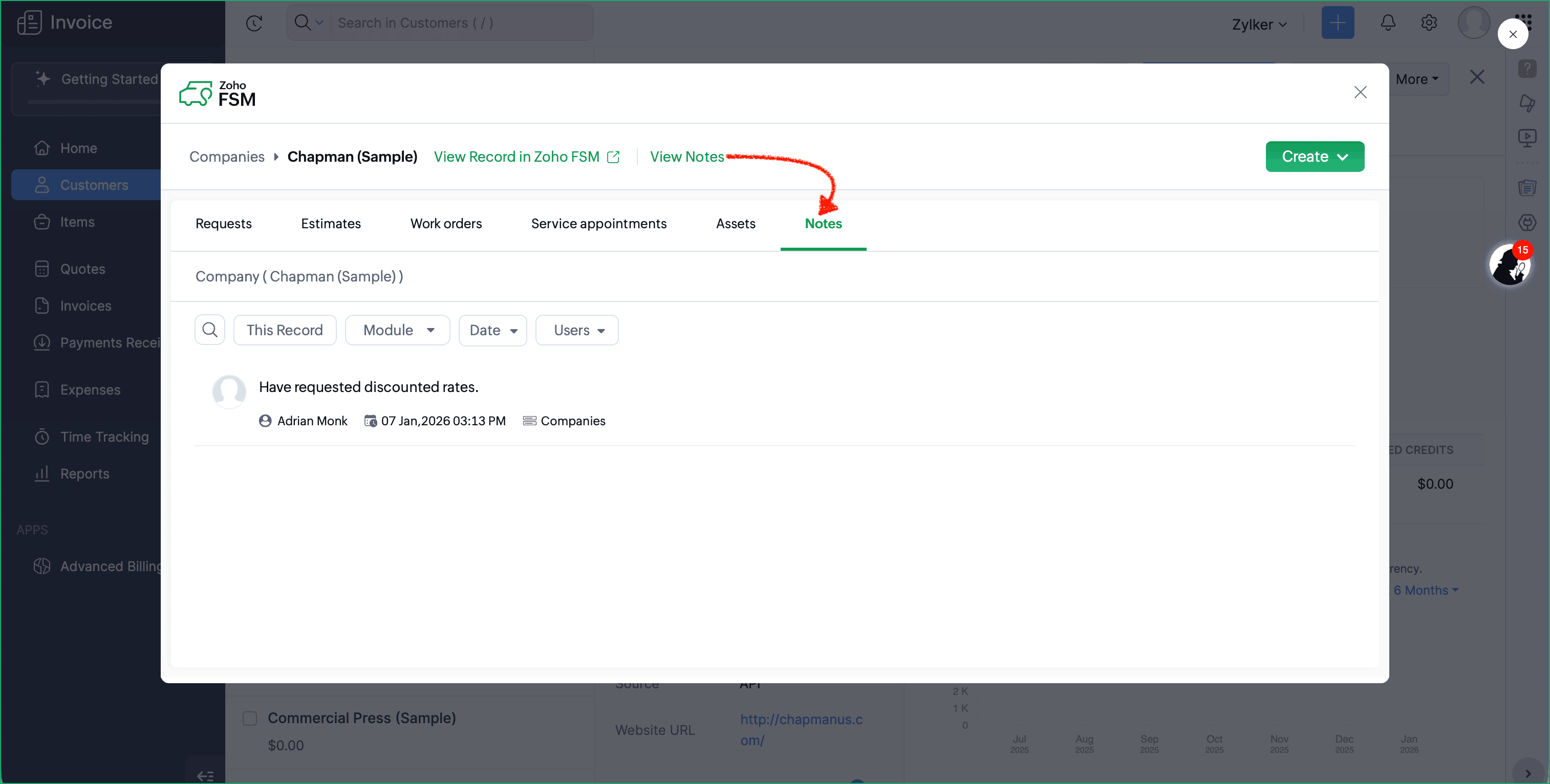 - Zoho FSM Customer Notes: Gain the necessary context through notes added to the Customer records by the service team.