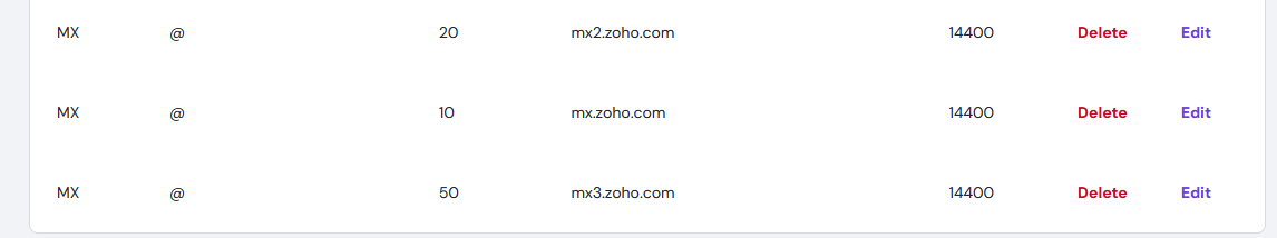 Problem is, zoho mail admin panel still shows (10 hours after move) that all records are correct while I haven't changed anything in my domain DNS records, MX records were pointing to domain provider's servers. I changed MX records to these, see this screenshot: