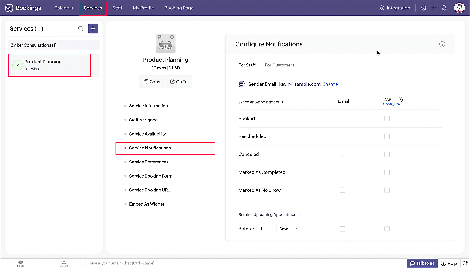 Note : Only users who have a Premium plan with Zoho Bookings can customize the sender email.