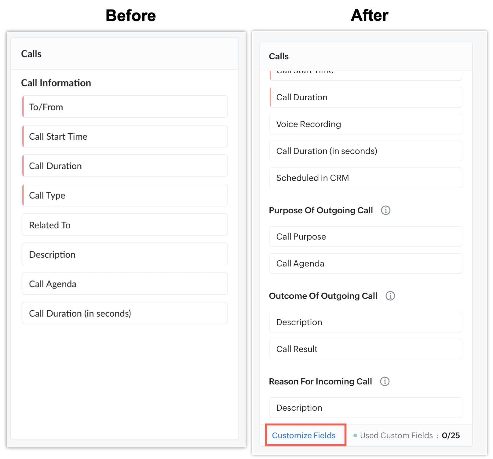 Each section is tailored to specific call types and statuses to ensure relevant fields are displayed situationally. We've also added six new fields to help capture detailed information, including Outgoing Call Status, Call Result, Call Purpose, Voice Recording, Scheduled in Bigin, and Telephony External ID.