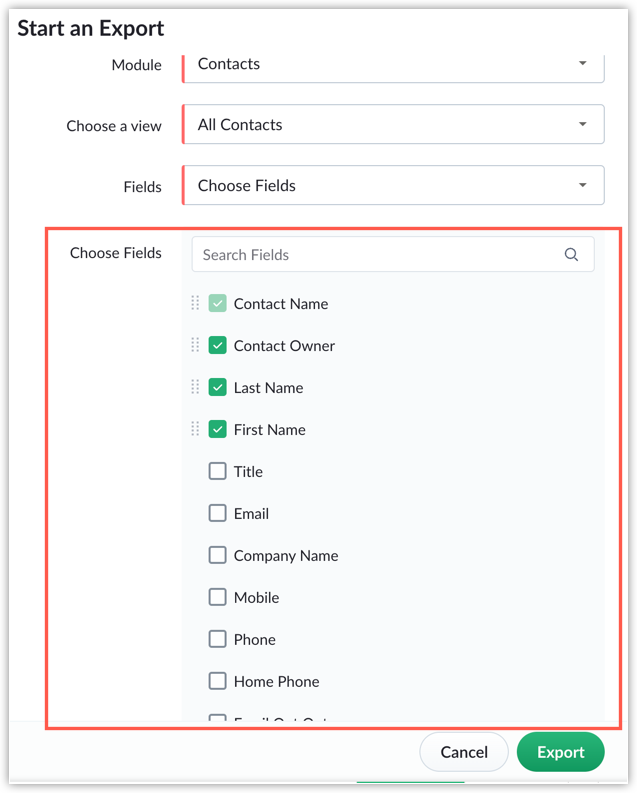 - Choose fields: Export only the fields you choose.