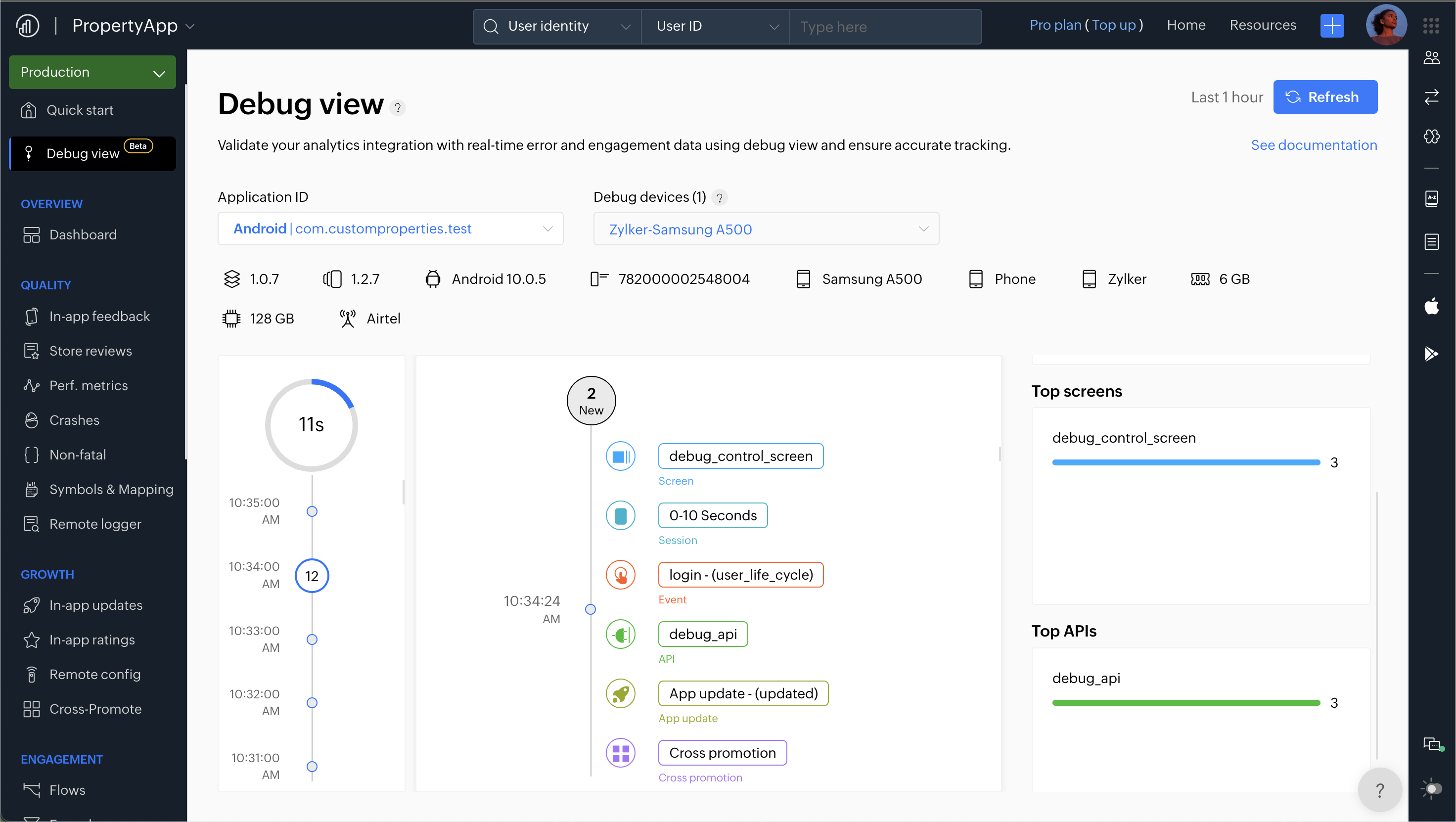Debug view logs the screens, APIs, errors (crashes, non-fatal, and ANRs), events, sessions, in-app updates, rate us prompts, remote configurations, and any associated custom properties for the last one hour within the Apptics console.