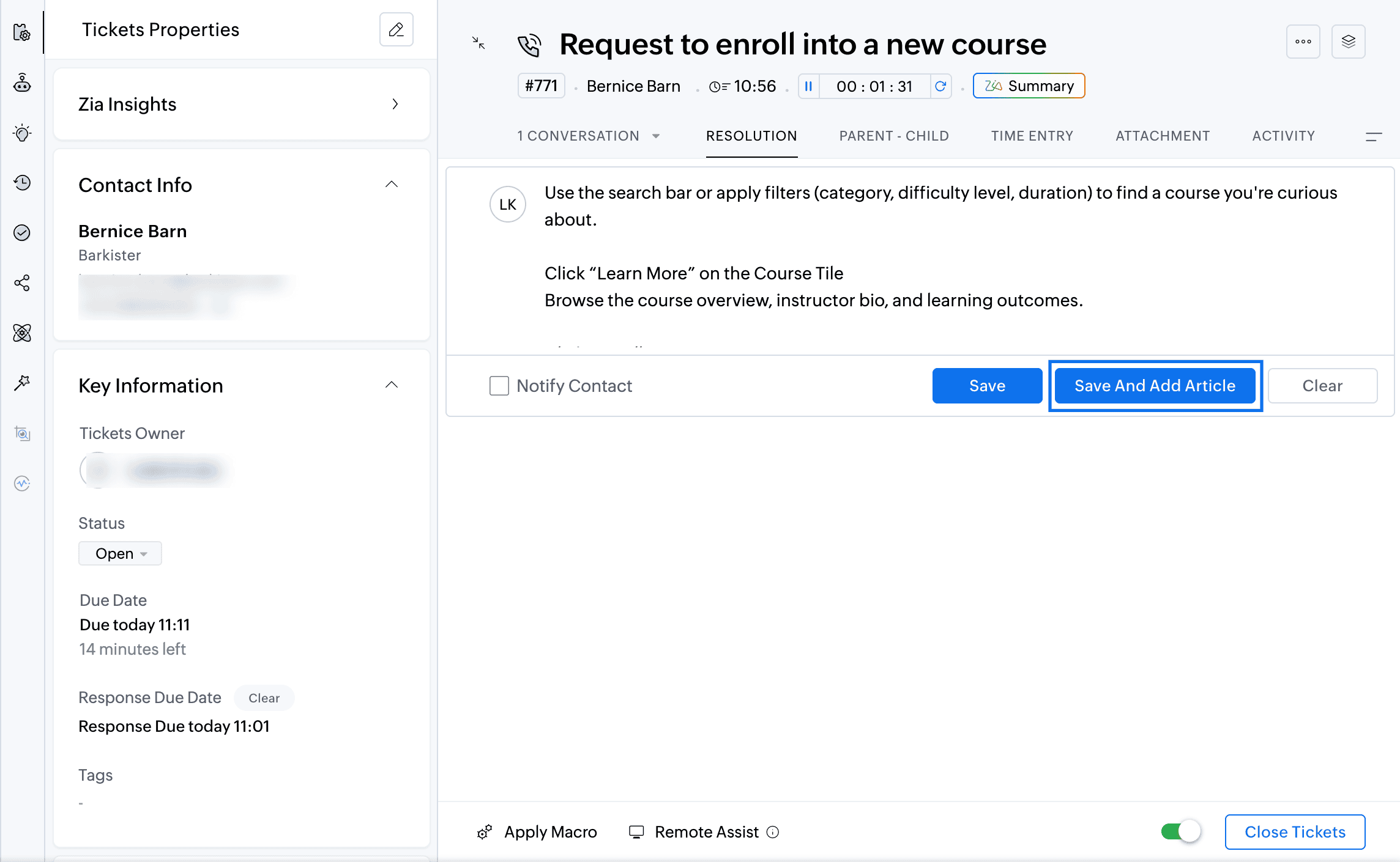 However, there's an option to add information from the Resolution under the Ticket tabs. While creating a resolution, the agent can select "Save And Add Article" to add the resolution to the Knowledge Base thereby giving Zia an option to train on the article.
