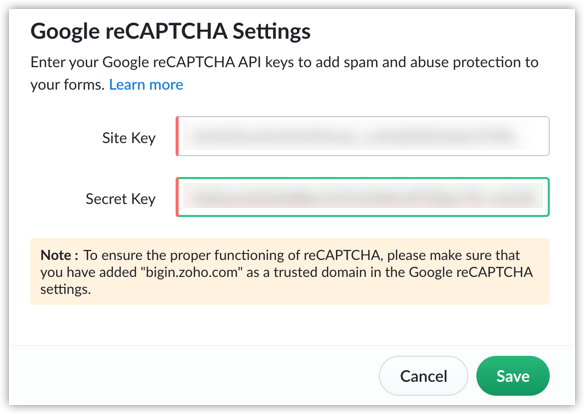 In Bigin Forms, you can now add Google's reCAPTCHA service to help prevent form submissions by bots or other spam services. To set reCAPTCHA up, you'll need to create a Site Key and Secret Key, which you can generate via the Google ReCAPTCHA site by providing a label name, reCAPTCHA type, and a domain name. The domain you set should be "crm.zohopublic.com". This is mandatory for Google reCAPTCHA to function properly.