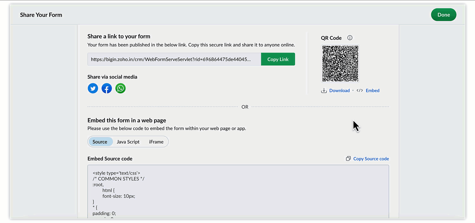 With this enhancement, users can now add form links directly to Twitter, Facebook, and WhatsApp. Choose the appropriate icon after creating a form and send it directly.