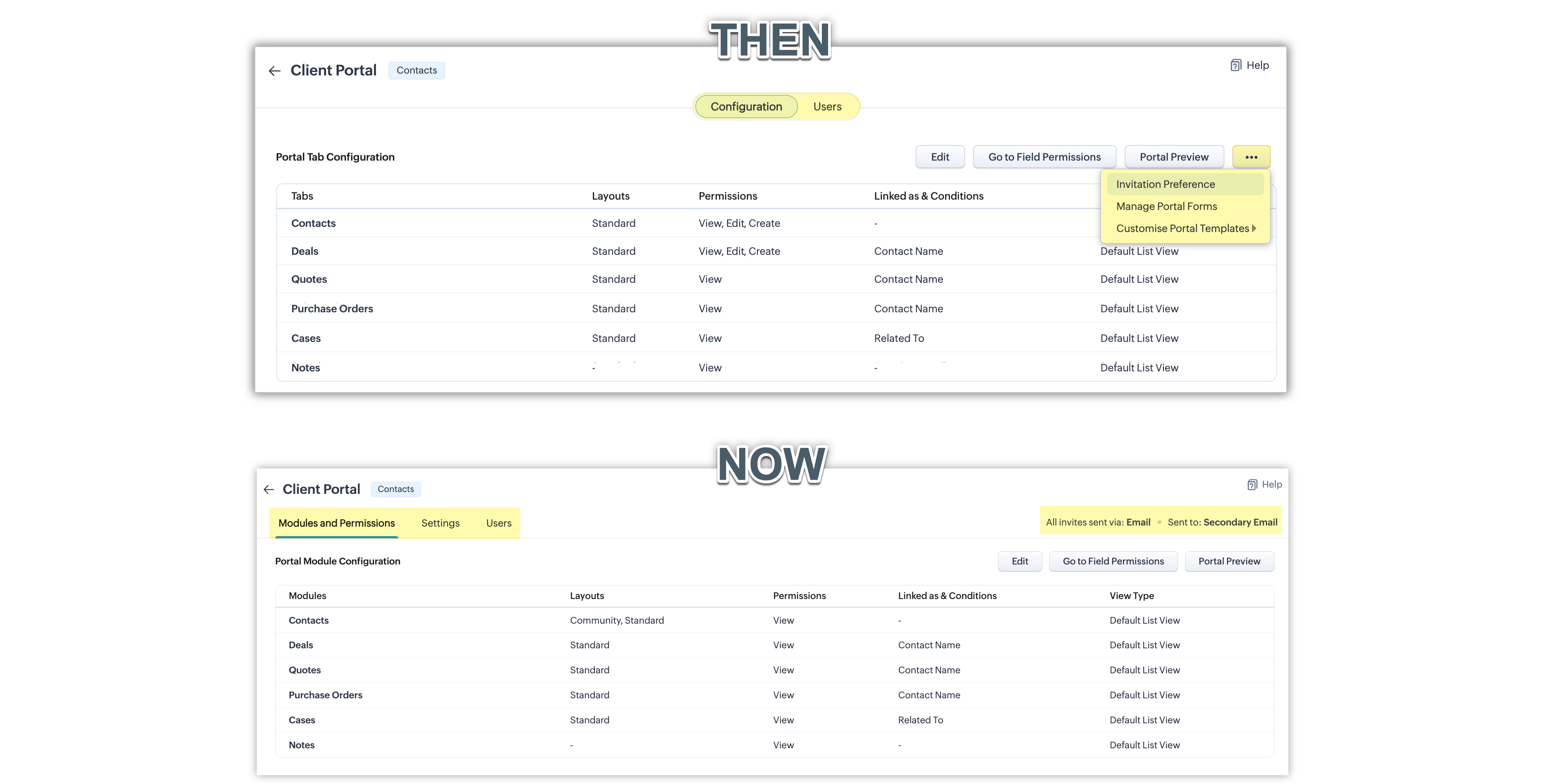 Under Modules and Permissions, you can set the desired tab configuration and permissions as usual. Options that were previously located under Configuration's ellipsis - Invitation Preference, Manage Portal Forms, and Customise Portal Templates have shifted places.