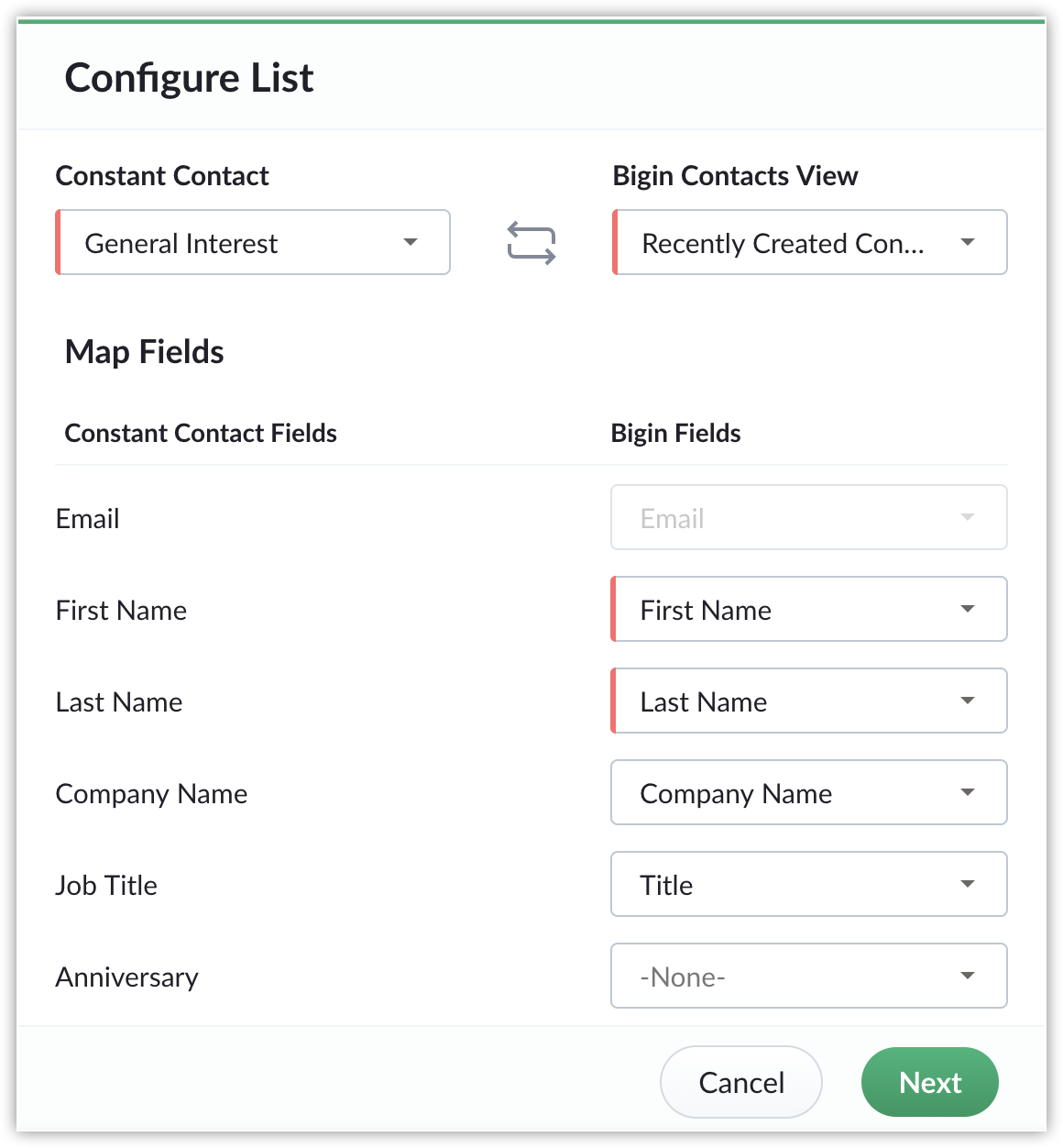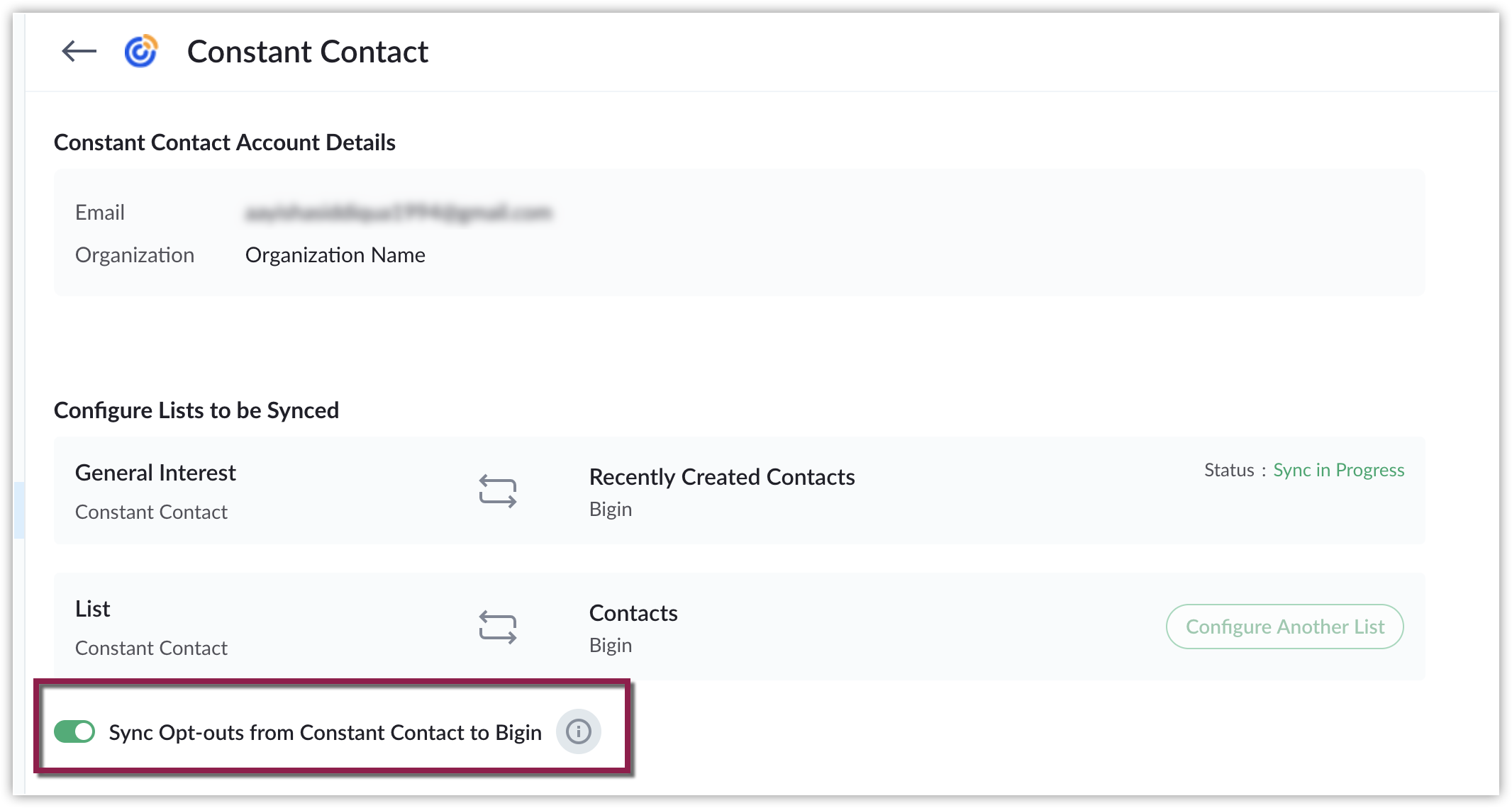- Sync the contacts between Constant Contact Lists and the List Views in Bigin.