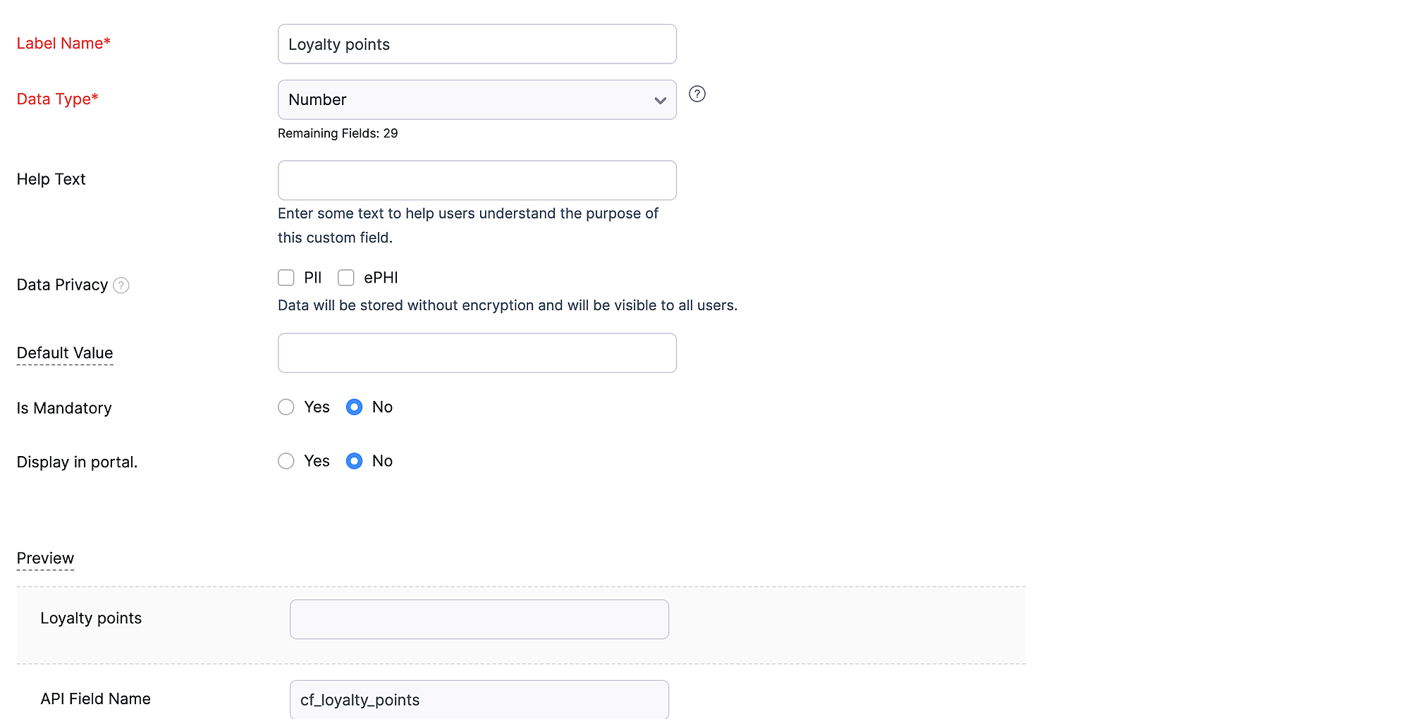 2. Create a Number type custom field named "Loyalty points" for the Customers module. This field will store the points earned by a customer.