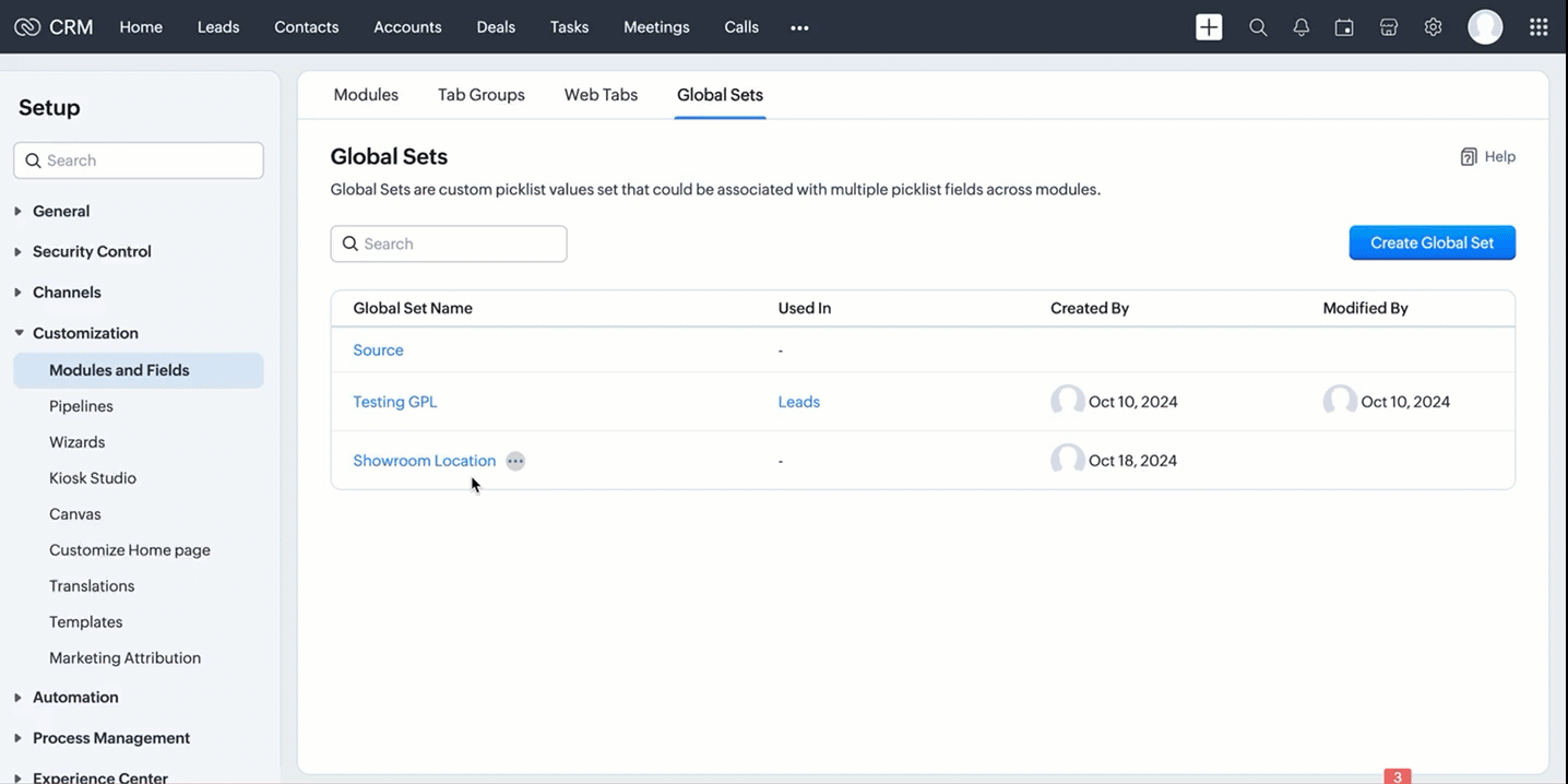 Global Sets or Global Picklists are collections of picklist values that can be associated with multiple picklists across modules. When you create Global Sets, you define a set of values that can be associated with fields in different CRM modules, ensuring uniformity in data input across your organization. Refer to this